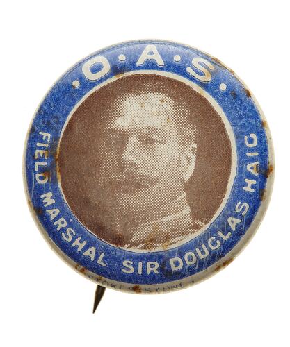 Badge for the O.A.S. (On Active Service) Fund depicting Sir Douglas Haig, British Field Marshal during World War I. The badge was made in Australia in 1917.