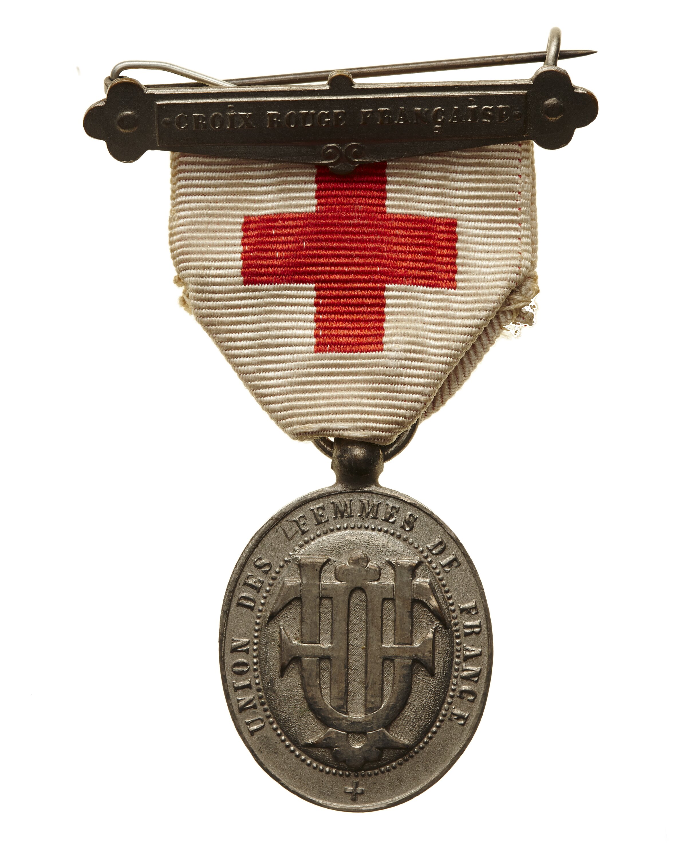Oval nickel medal with loop at top through which, a white ribbon with red cross; a bar with pin at back at top of ribbon. The obverse features the cypher UFF at the centre; around, UNION DES FEMMES DE FRANCE; on the bar, CROIX ROUGE FRANCAISE. The reverse is plain.
