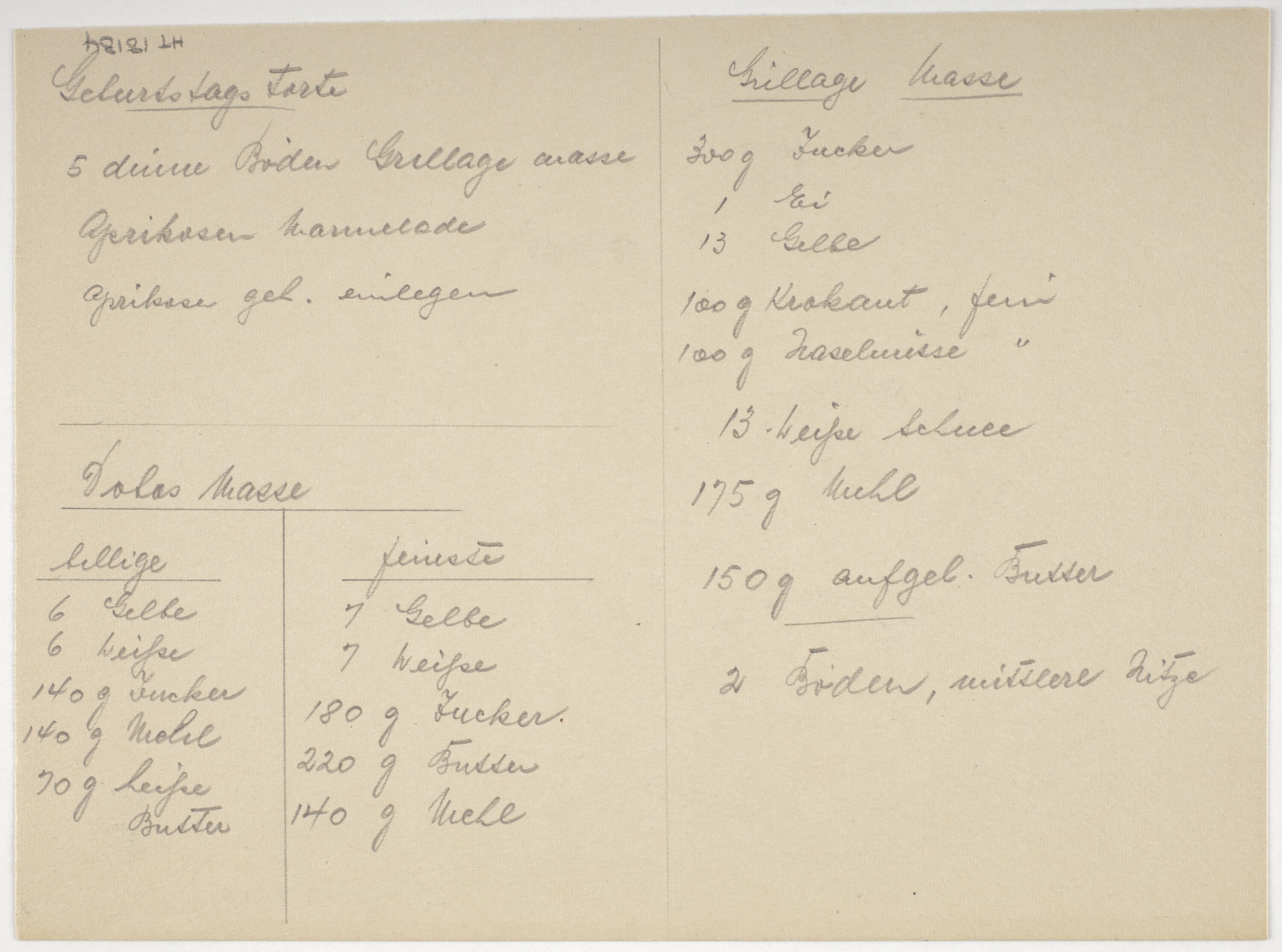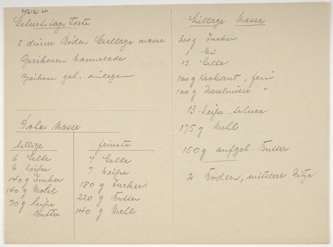 Cake design by Karl Muffler detailing particulars of colour and decoration. Hand drawn in coloured pencil. Includes some recipes and instructions in English and German on reverse side. Design for a round cake.