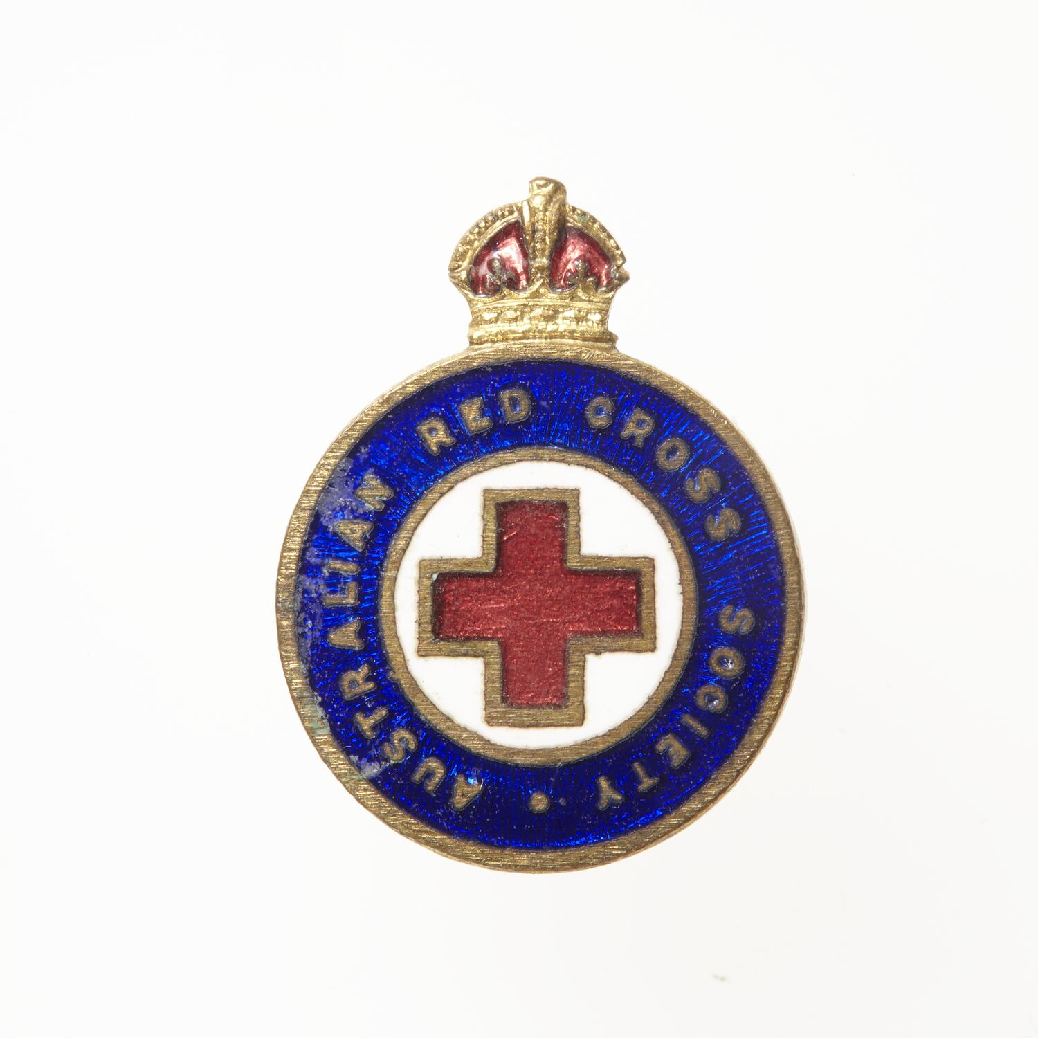 A crowned round gilt and enamel badge with pin on reverse. The obverse features at the centre, a red cross on a white background; around on a blue background, AUSTRALIAN RED CROSS SOCIETY. The reverse has the makers name stamped below the pin, STOKES.