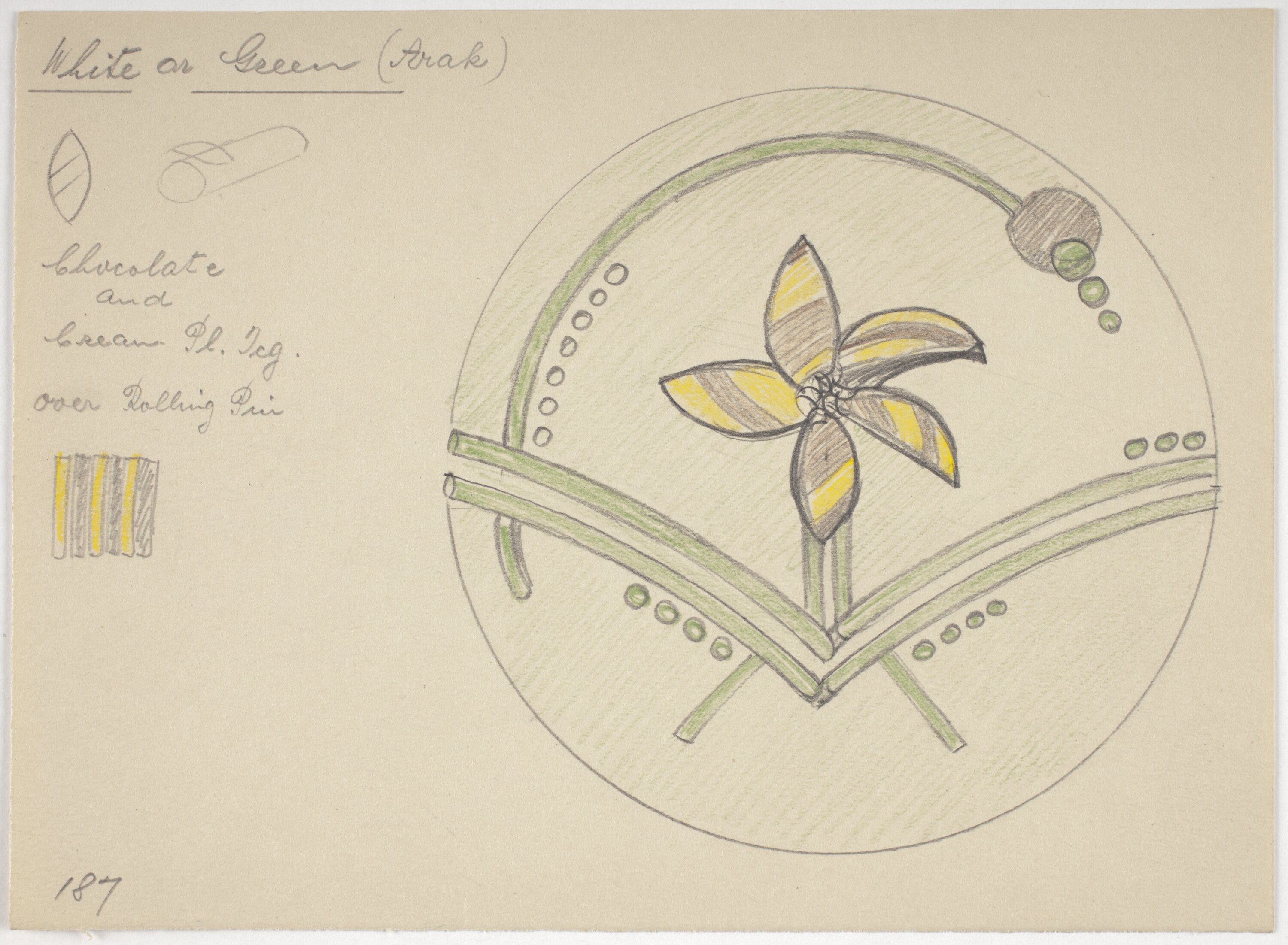 Cake design by Karl Muffler detailing particulars of colour and decoration. Hand drawn in coloured pencil. Includes some recipes and instructions in English and German on reverse side. Design for a round cake.