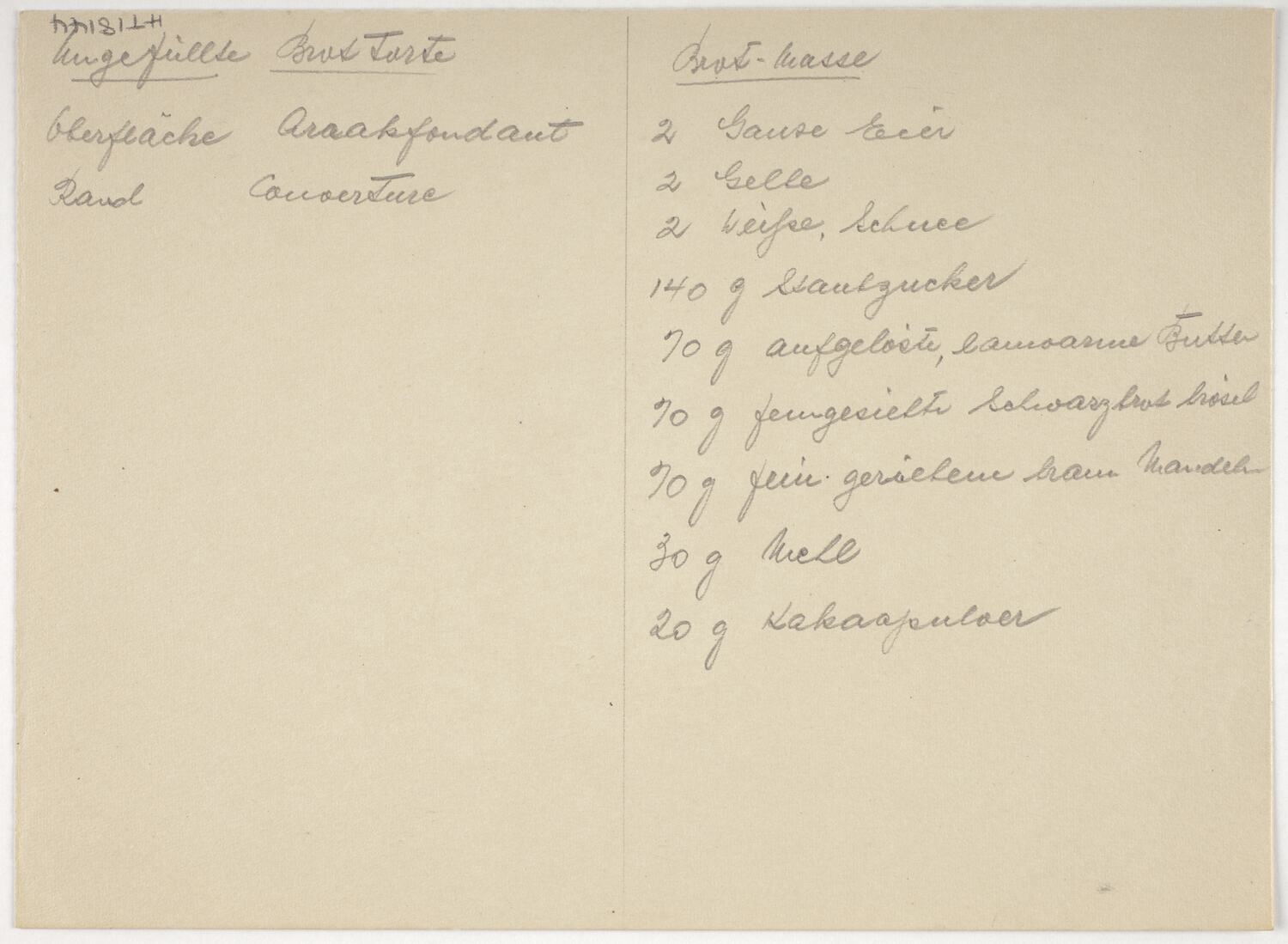 Cake design by Karl Muffler detailing particulars of colour and decoration. Hand drawn in coloured pencil. Includes some recipes and instructions in English and German on reverse side. Design for a round cake.