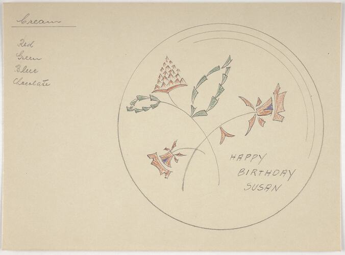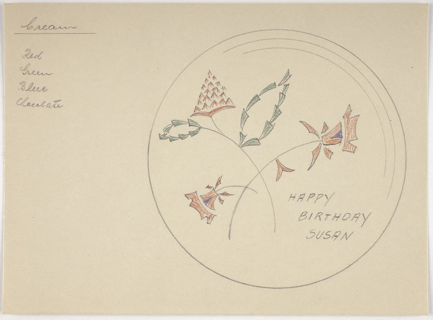 Cake design drawn in colour, inscribed with 'Happy Birthday Susan', by Karl Muffler and used by him in his work and used by him during his career as a pastry chef and confectioner in Melbourne from the 1930s.