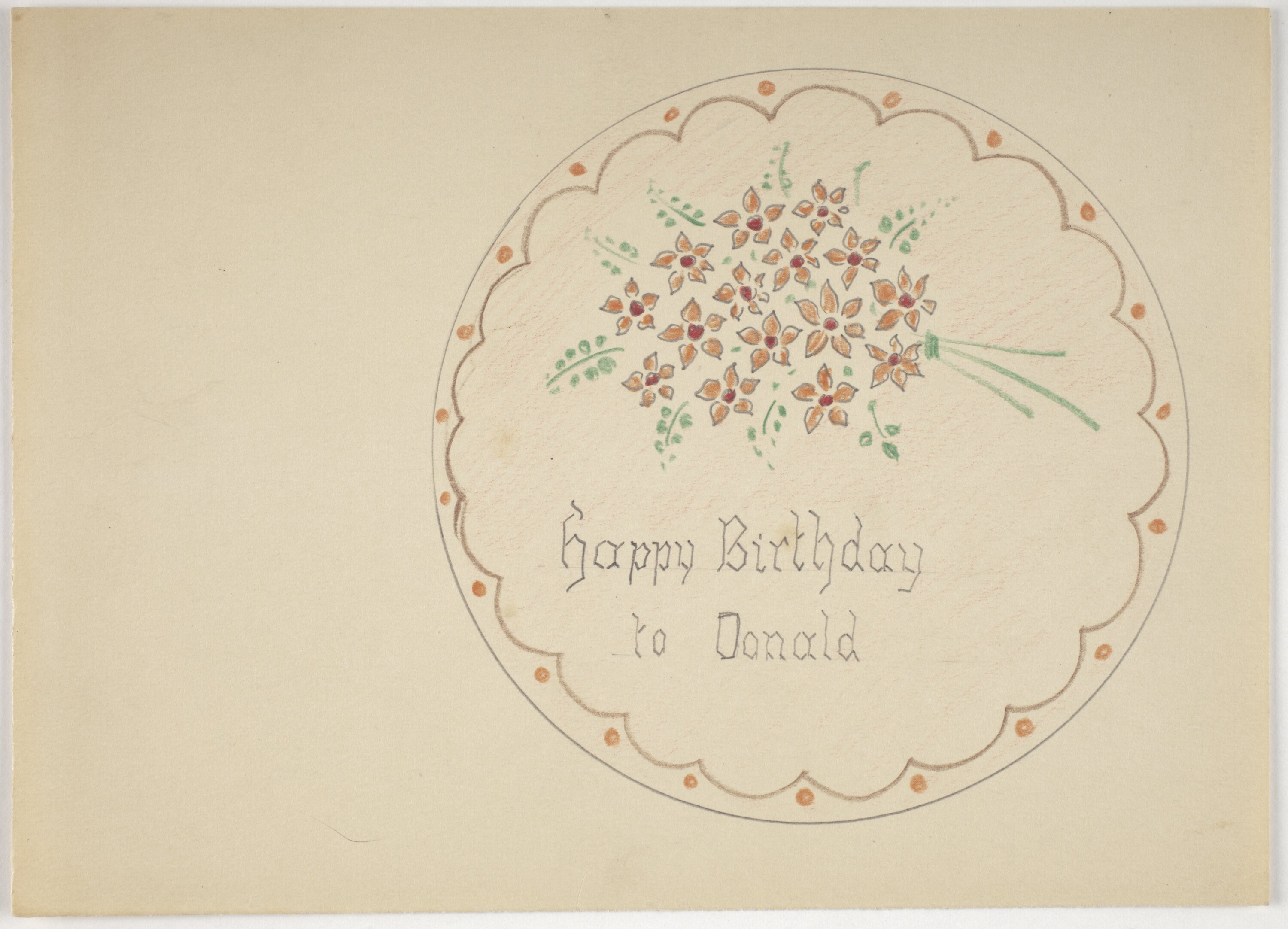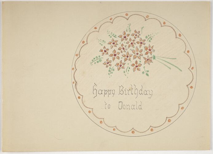Cake design drawn in colour, inscribed with 'Happy Birthday to Donald', by Karl Muffler and used by him during his career as a pastry chef and confectioner in Melbourne from the 1930s.