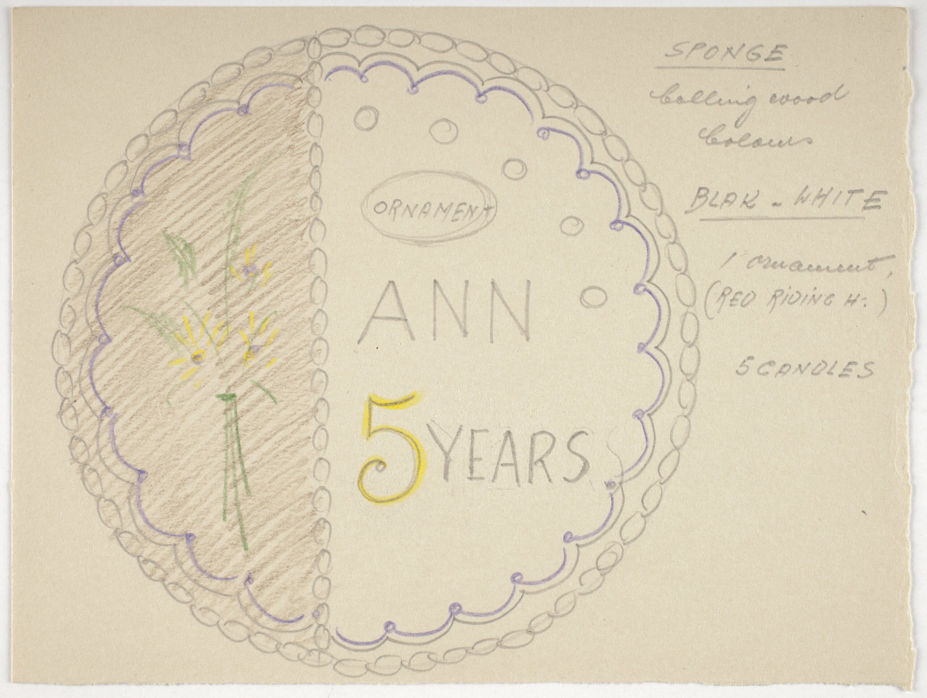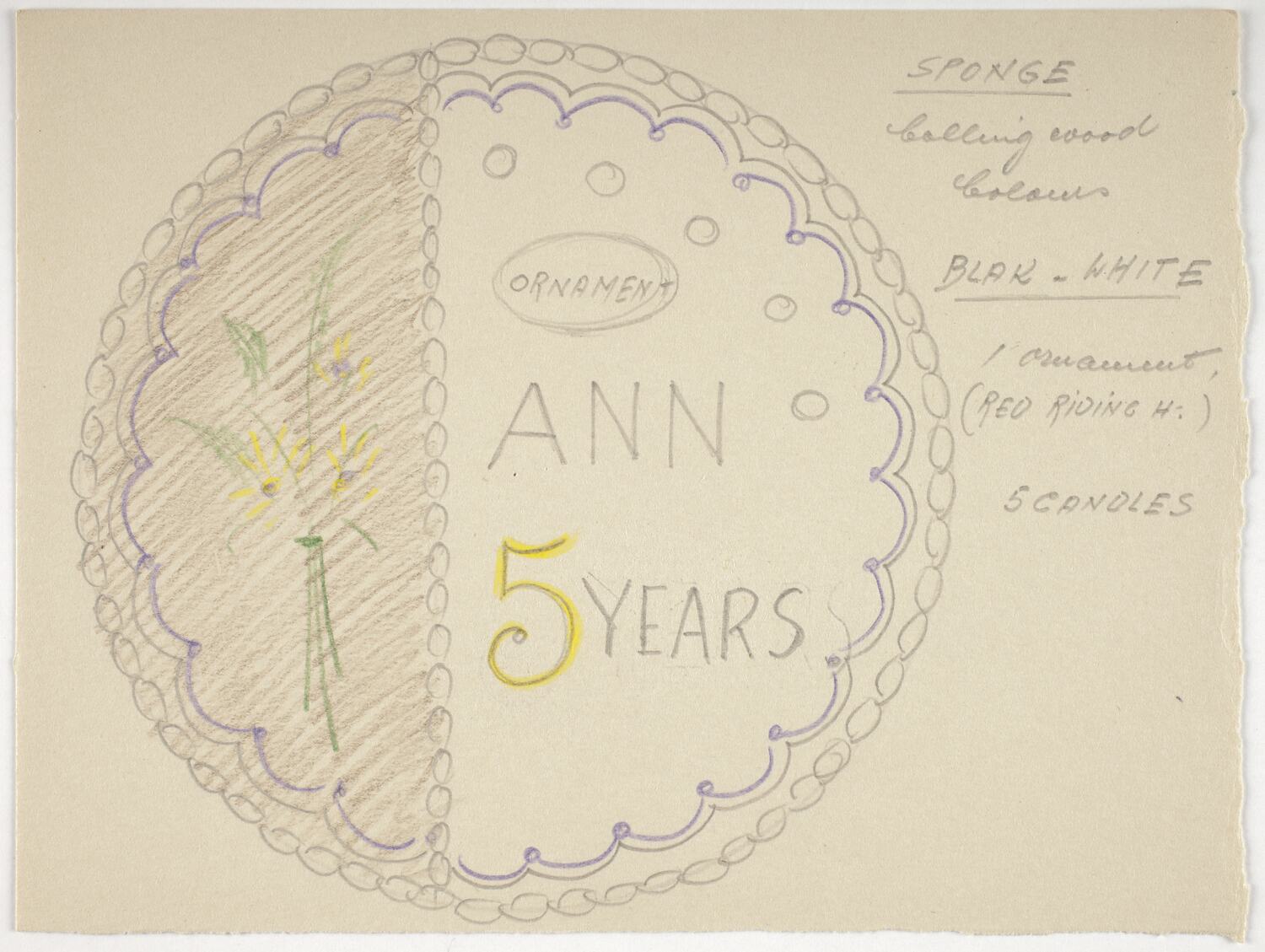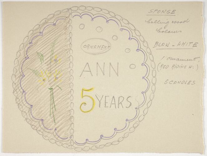 Cake design drawn in colour, with inscription 'Ann 5 Years', by Karl Muffler in Australia and used by him during his career as a pastry chef and confectioner in Melbourne from the 1930s.