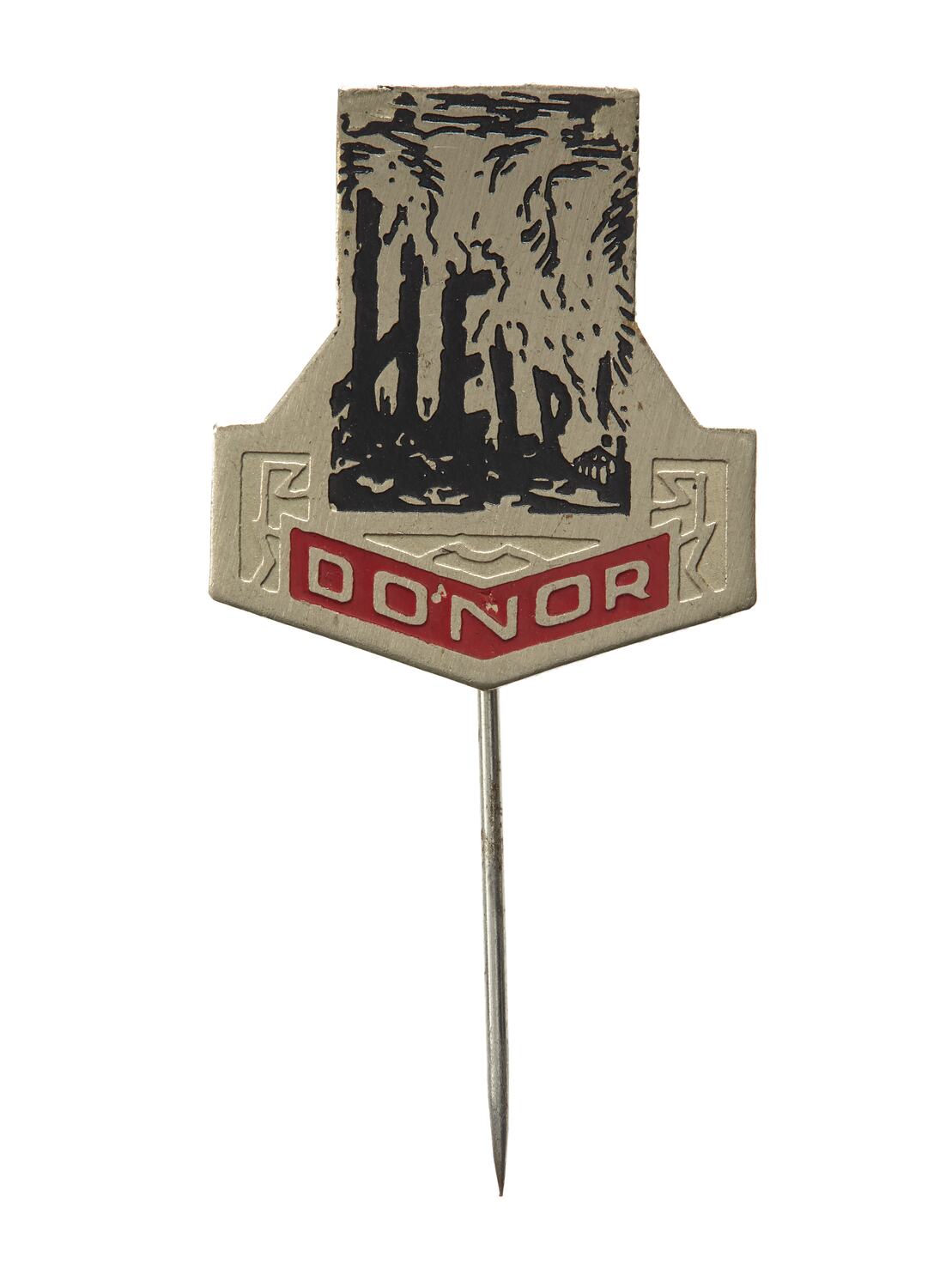 A steel and enamel badge with pin on reverse. The obverse features at the centre, the word HELP! styled as burning trees; below on a red background, DONOR.