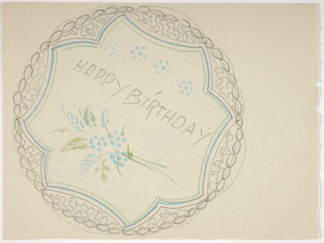 Cake design drawn in colour, featuring inscription 'Happy Birthday', by Karl Muffler and used by him during his career as a pastry chef and confectioner in Melbourne from the 1930s.