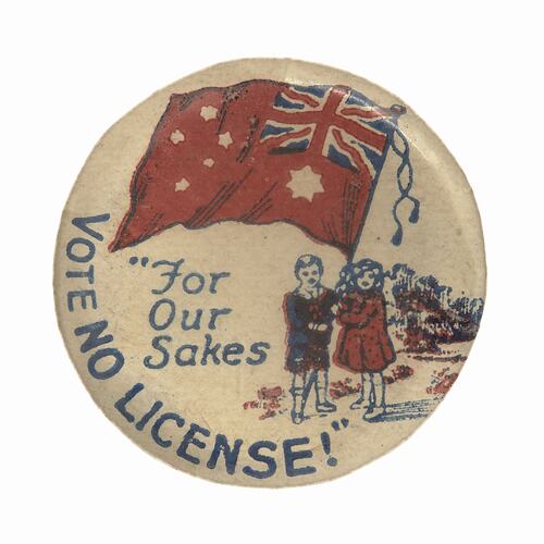 This badge, also known as a button, was produced in relation to the Prohibition Referendum, Victoria, Australia, circa 1925. It was issued by the Victorian Anti-Liquor League at 182 Collins Street, Melbourne. Prohibition was an issue in Australia throughout the 1920s, in part a result of societal problems following World War I. Other nations also faced the issue of how to control alcohol consumption. Alcohol was depicted as the enemy of a sedate home life, encouraged following the upheavals of World War I. Australia's Prohibition Laws were repealed in 1928.