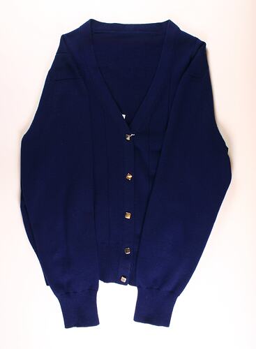 Knitted navy cardigan, made by Edda Azzola for commercial purposes but not sold on to the factory. Edda Azzola, nee Pugnetti, was born in 1927 in Moggio Udinese in the Friuli region, northern Italy and the family moved to nearby Pontebba four years later. In Italy Edda and her two sisters worked as knitting machinists from the family home. Edda married Angelo Azzola, a young man from her village and they migrated to Australia in the mid 1950s.