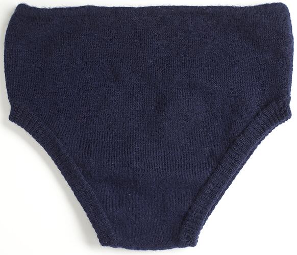This pair of woollen male bathing trunks was made by Italian migrant Edda Azzola on the family knitting machine in Italy in the 1950s. Edda was a domestic knitting machinist by trade and made two pairs of bathing trunks for her husband and a pair of bathers for herself for them to take to Australia. Edda wore her bathers only a couple of times.