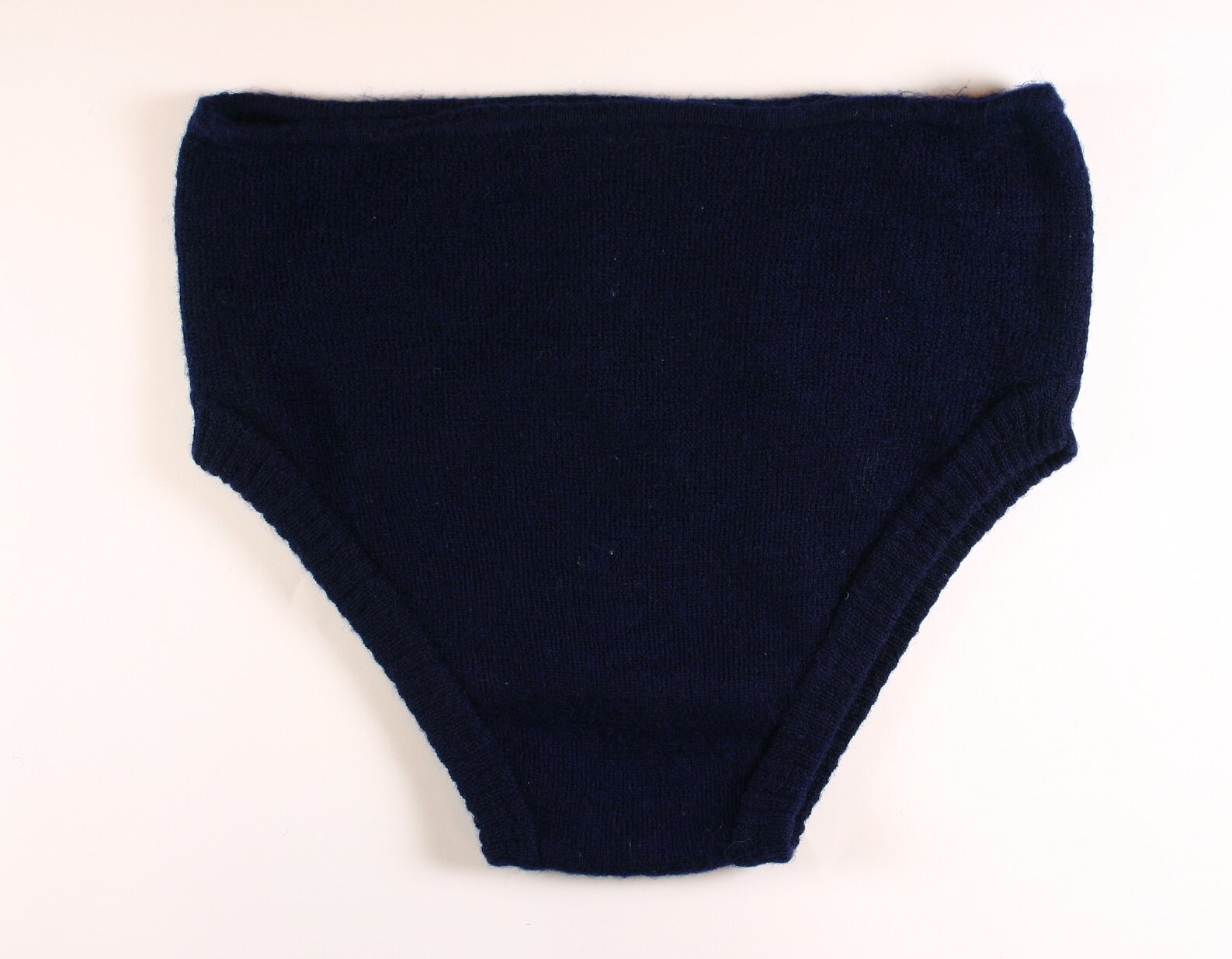 This pair of woollen male bathing trunks was made by Italian migrant Edda Azzola on the family knitting machine in Italy in the 1950s. Edda was a domestic knitting machinist by trade and made two pairs of bathing trunks for her husband and a pair of bathers for herself for them to take to Australia. Edda wore her bathers only a couple of times.