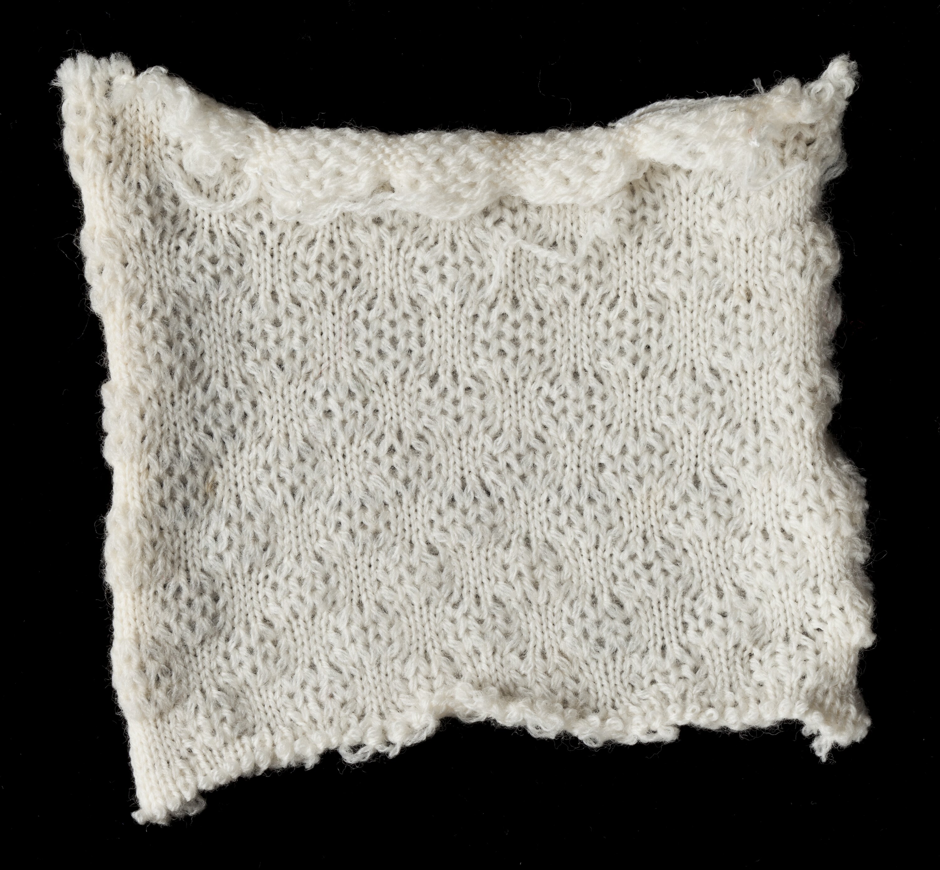 Small knitting sample. Cream coloured with a repeating block pattern.
