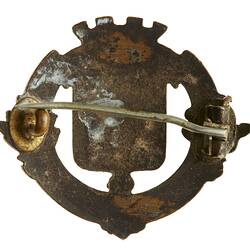 Voided brass and enamel badge with pin on back. At centre a red shield on which a hand holds a short staff surmounted by the letter C; above, a mural crown; around below on blue background, 'POPERINGHE'. The reverse is plain.