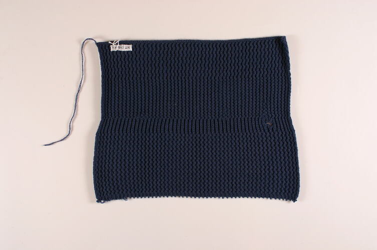 Blue Knitting sample, one of many made by Edda Azzola to test designs prior to making a garment. Edda Azzola, nee Pugnetti, was born in 1927 in Moggio Udinese in the Friuli region, northern Italy and the family moved to nearby Pontebba four years later. In Italy Edda and her two sisters worked as knitting machinists from the family home. Edda married Angelo Azzola, a young man from her village and they migrated to Australia in the mid 1950s.