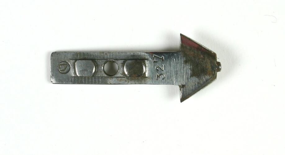 An arrow head shaped piece of metal attached to a longer stem, with a small hole in the tip of the arrow head, for guiding yarn. The arm has one hole for a screw attachment, and four small raised ridges on the back.