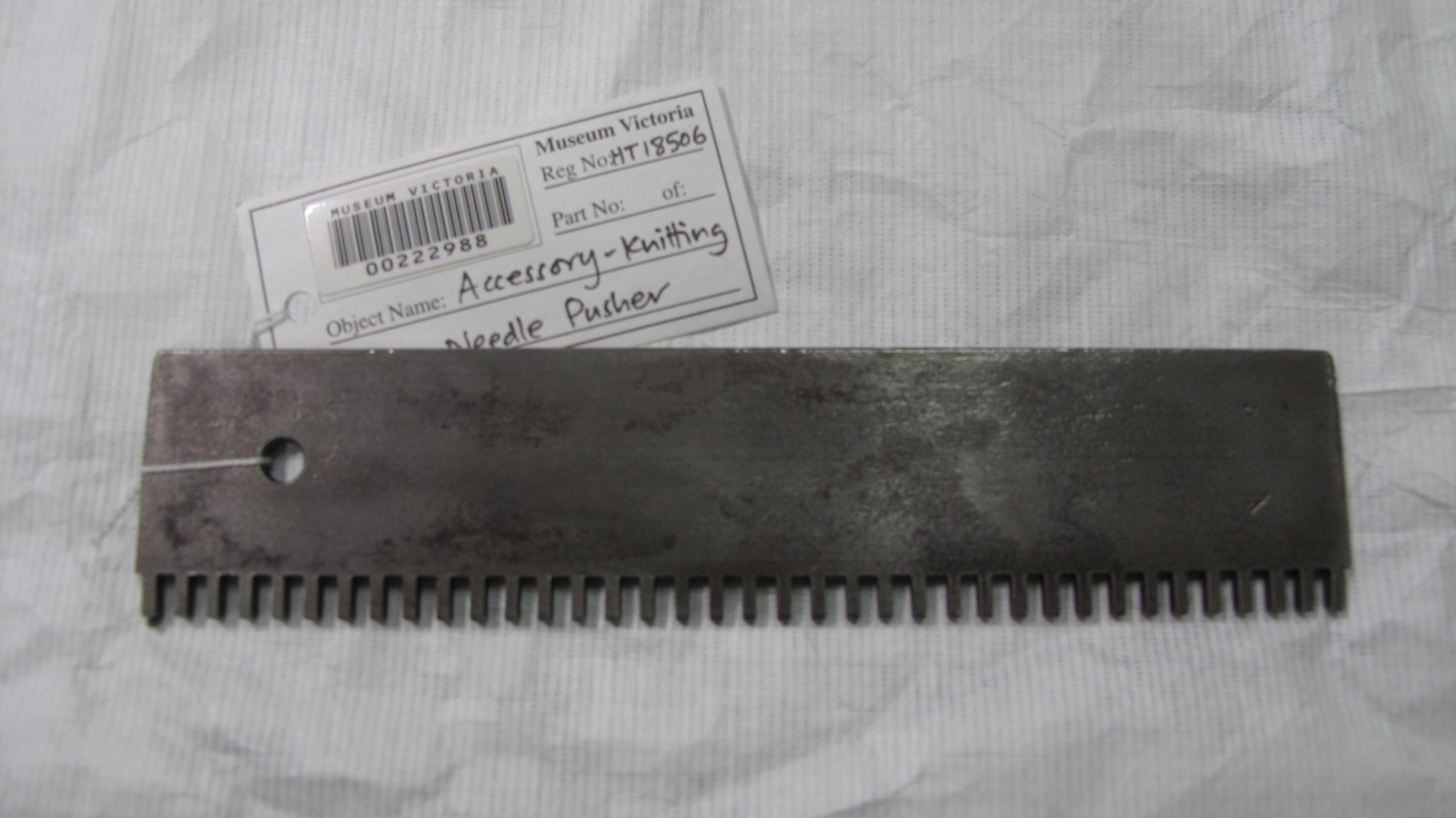 Needle Pusher used with 'Dubied' knitting machine, used by Edda Azzola from 1950 to 2000 for making commercial and personal clothing. This 'Dubied' knitting machine was brought to Australia from Italy in the 1950s by an Italian migrant woman and then sold to the Edda, who had migrated to Melbourne from Italy in 1955. Edda used it to supply a Collingwood knitting mill with finely finished clothes for sale to Melbourne department stores, until the factory closed in 1974. It was then used to make family clothes.