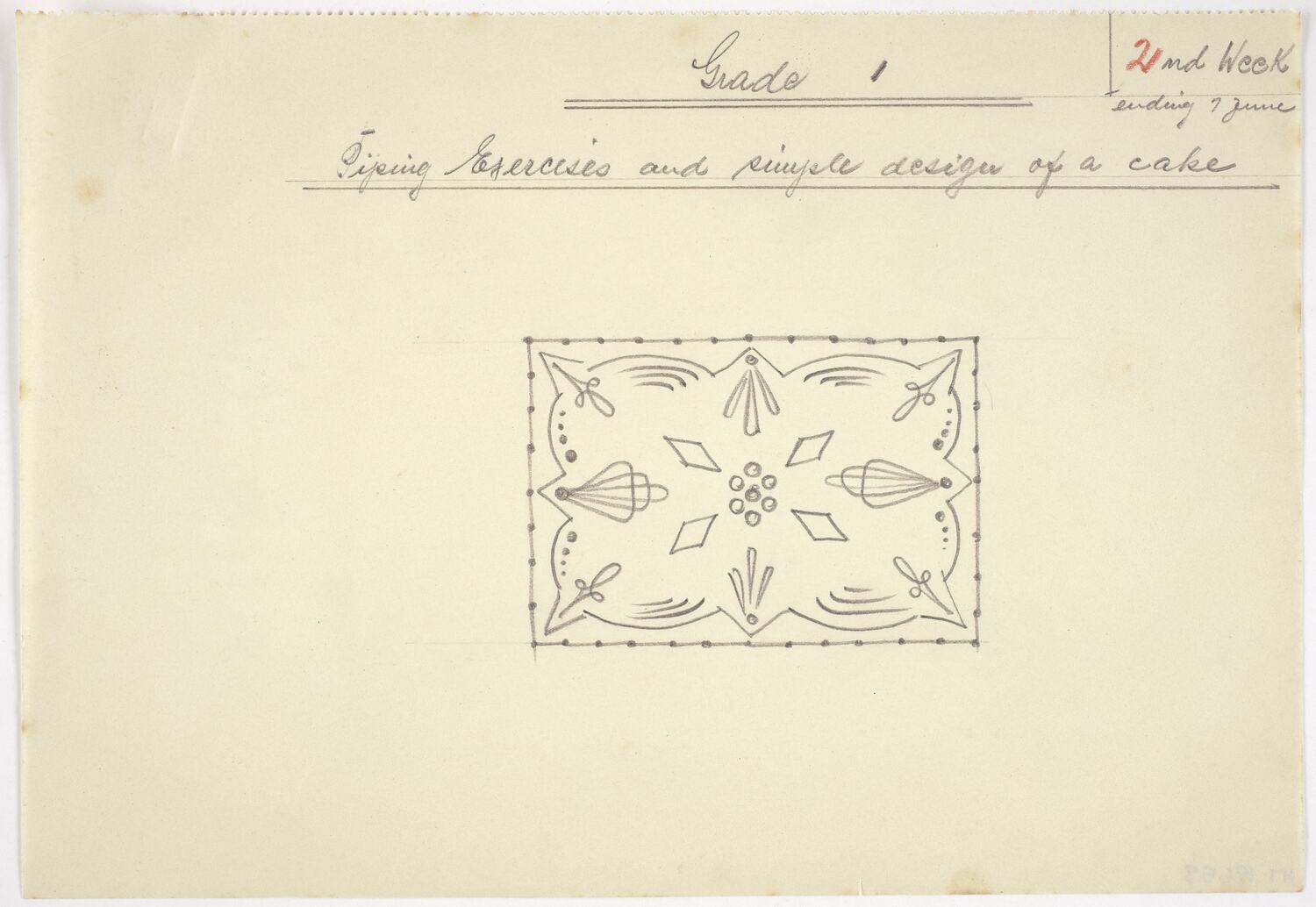 Lesson plan for Grade 1, 2nd week. Hand drawn cake decoration design for square cake in grey pencil on paper with red pencil numbering. Top edge of page is perforated. Some foxing.