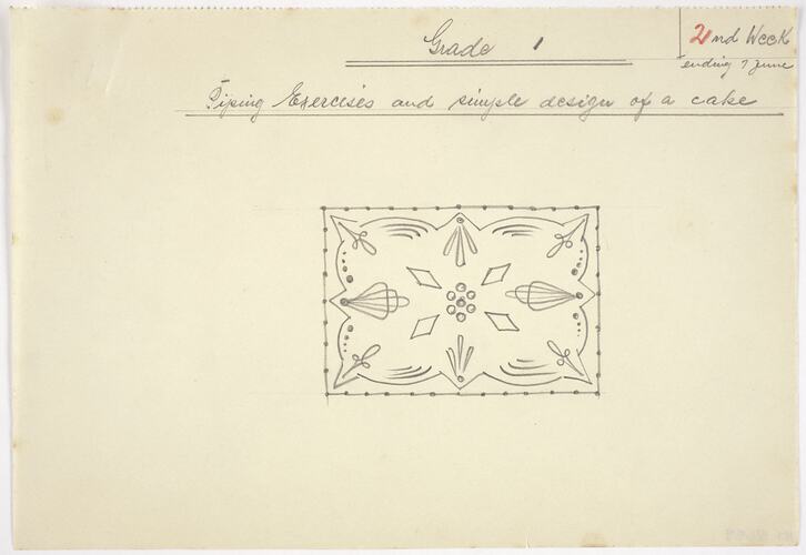 This is a lesson plan for cake decorating Grade 1, June, Week 2 - 'Piping excercises and simple design of a cake.' It features a hand-drawn cake decoration design. Karl Muffler taught a cake decorating class to 60 returned ex-servicemen at William Angliss Food Trades School in Melbourne from May to August, 1947, under the Commonwealth Reconstruction Scheme. Karl took groups of 15 students at a time, receiving 20 shillings per two-hour session.