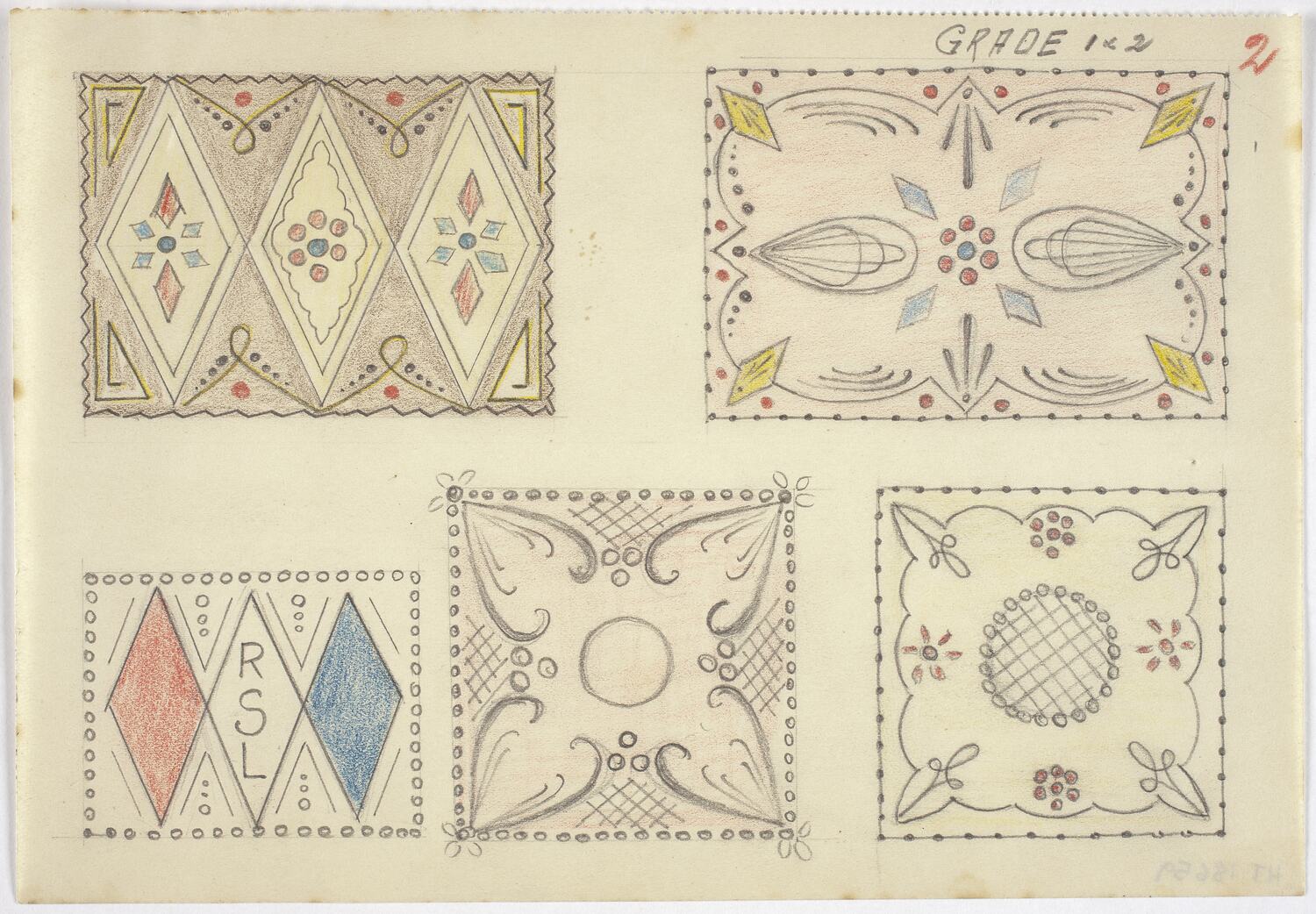 Lesson plan for Grade 1, 4th week. Five hand drawn cake decoration designs for square cakes in grey and coloured pencil on paper with red pencil numbering. Top edge of page is perforated.