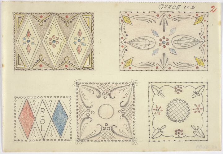 This is a lesson plan for cake decorating Grade 1, Week 4. It includes five hand drawn cake decoration designs. Karl Muffler taught a cake decorating class to 60 returned ex-servicemen at William Angliss Food Trades School in Melbourne from May to August, 1947, under the Commonwealth Reconstruction Scheme. Karl took groups of 15 students at a time, receiving 20 shillings per two-hour session.