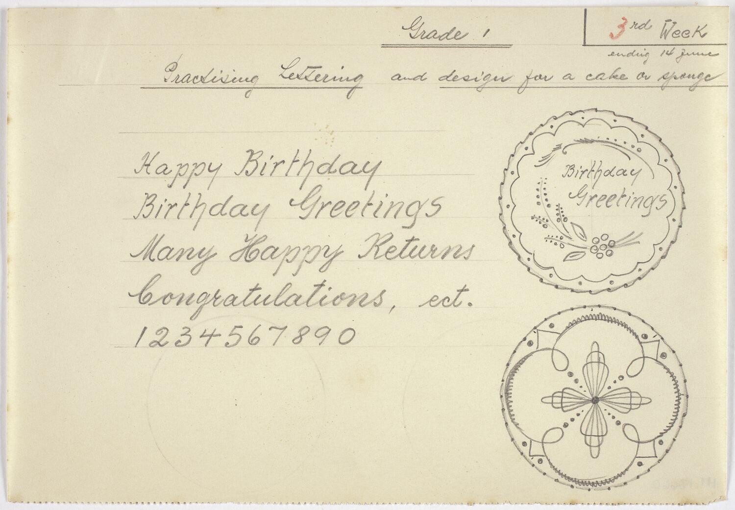 Handwritten across top: 'Grade 1 / 3rd WEEK ending 14 June.' Handwritten: 'Practising Lettering and design for a cake or sponge / Happy Birthday / Birthday Greetings / Many Happy Returns / Congratulations, ect. / 1234567890 '. Handwritten on cake design: 'Birthday Greetings'.