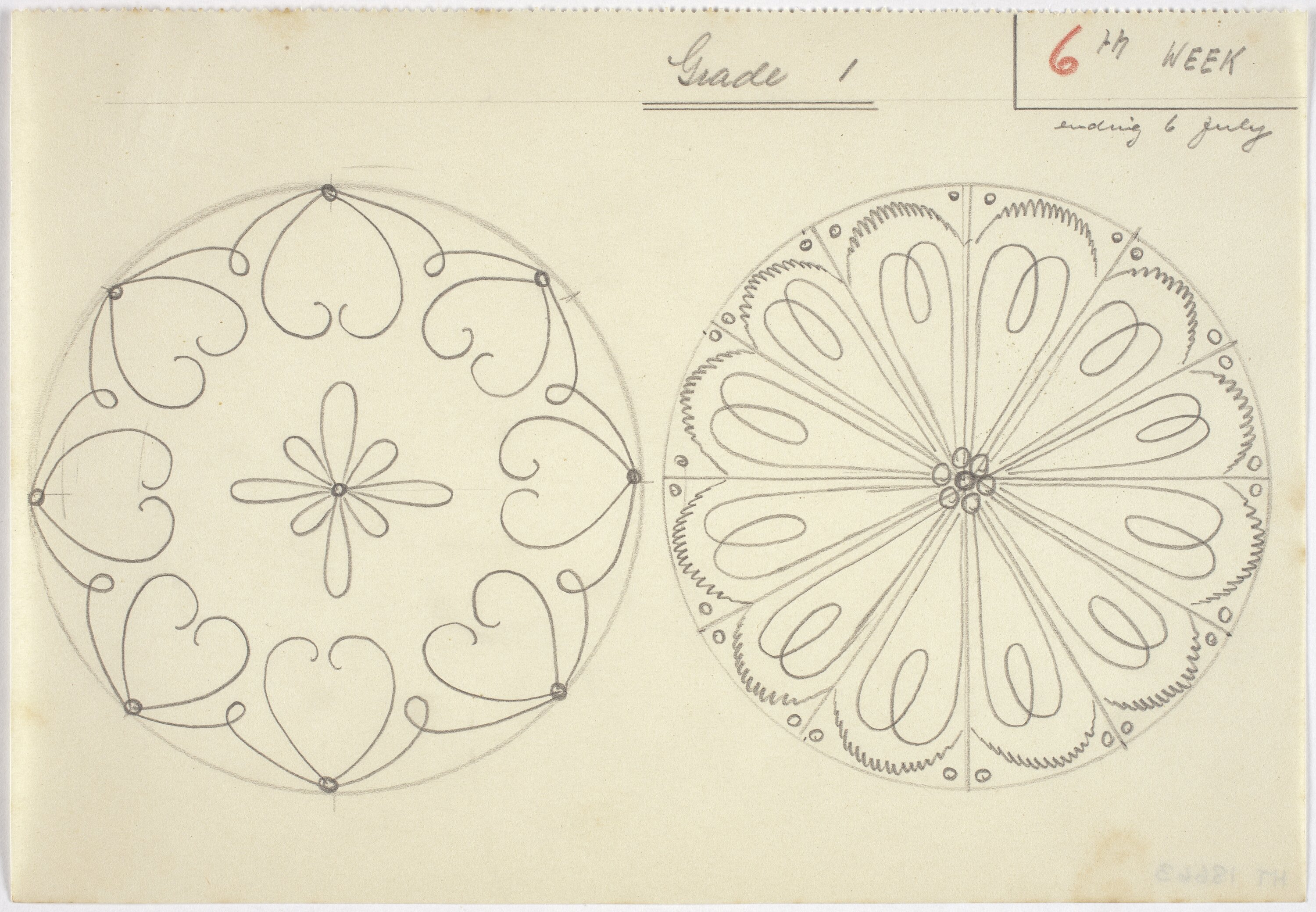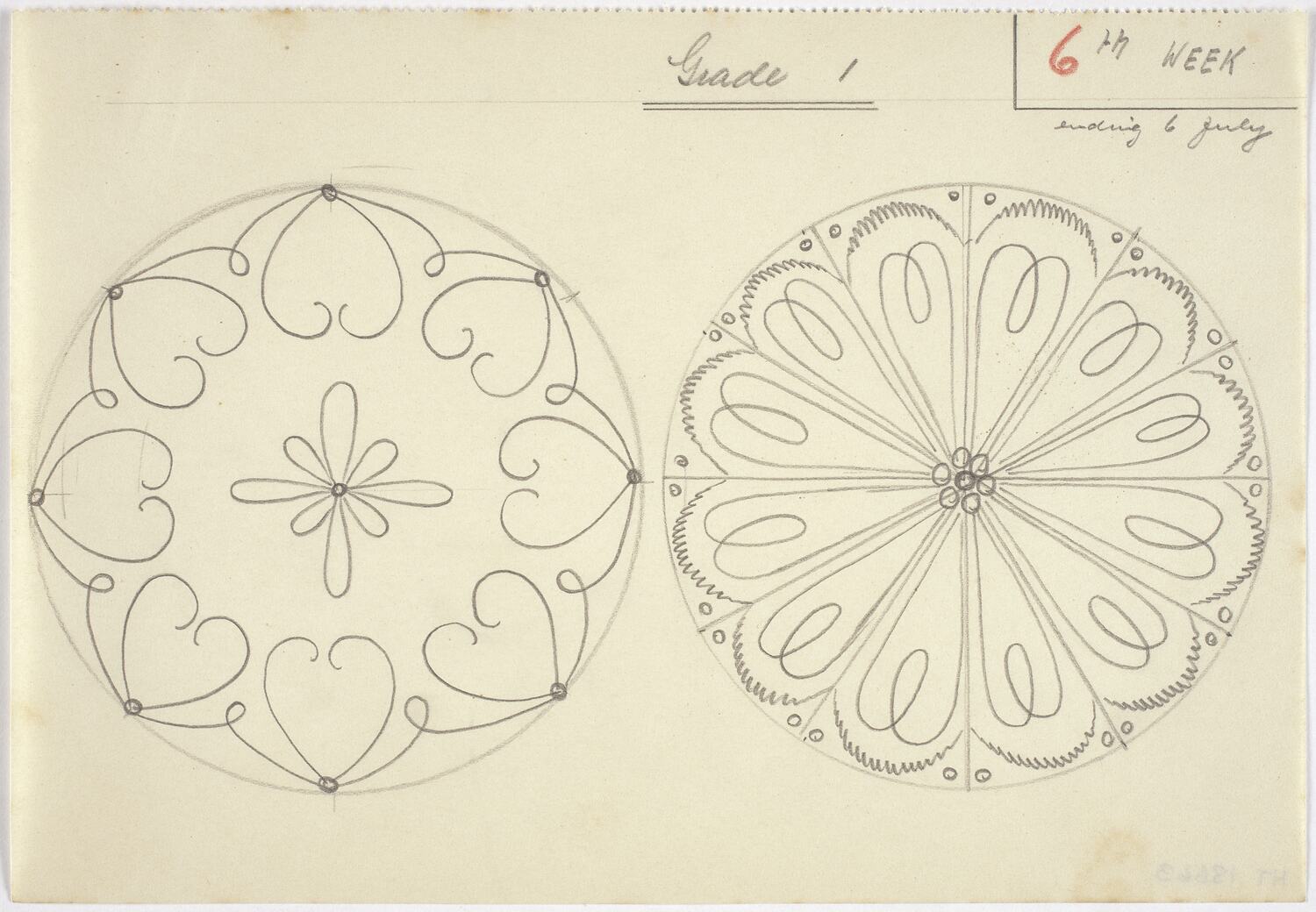 Lesson plan for Grade 1, 6th week. Hand drawn cake decoration designs for two cakes in grey pencil on paper with red pencil numbering. Top edge of page is perforated.