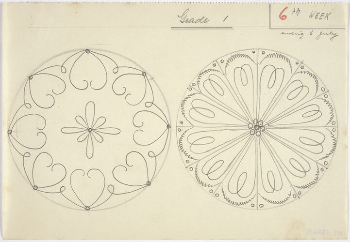 This is a lesson plan for cake decorating Grade 1, July, Week 6. It features hand-drawn cake decoration designs for two cakes. Karl Muffler taught a cake decorating class to 60 returned ex-servicemen at William Angliss Food Trades School in Melbourne from May to August, 1947, under the Commonwealth Reconstruction Scheme. Karl took groups of 15 students at a time, receiving 20 shillings per two-hour session.
