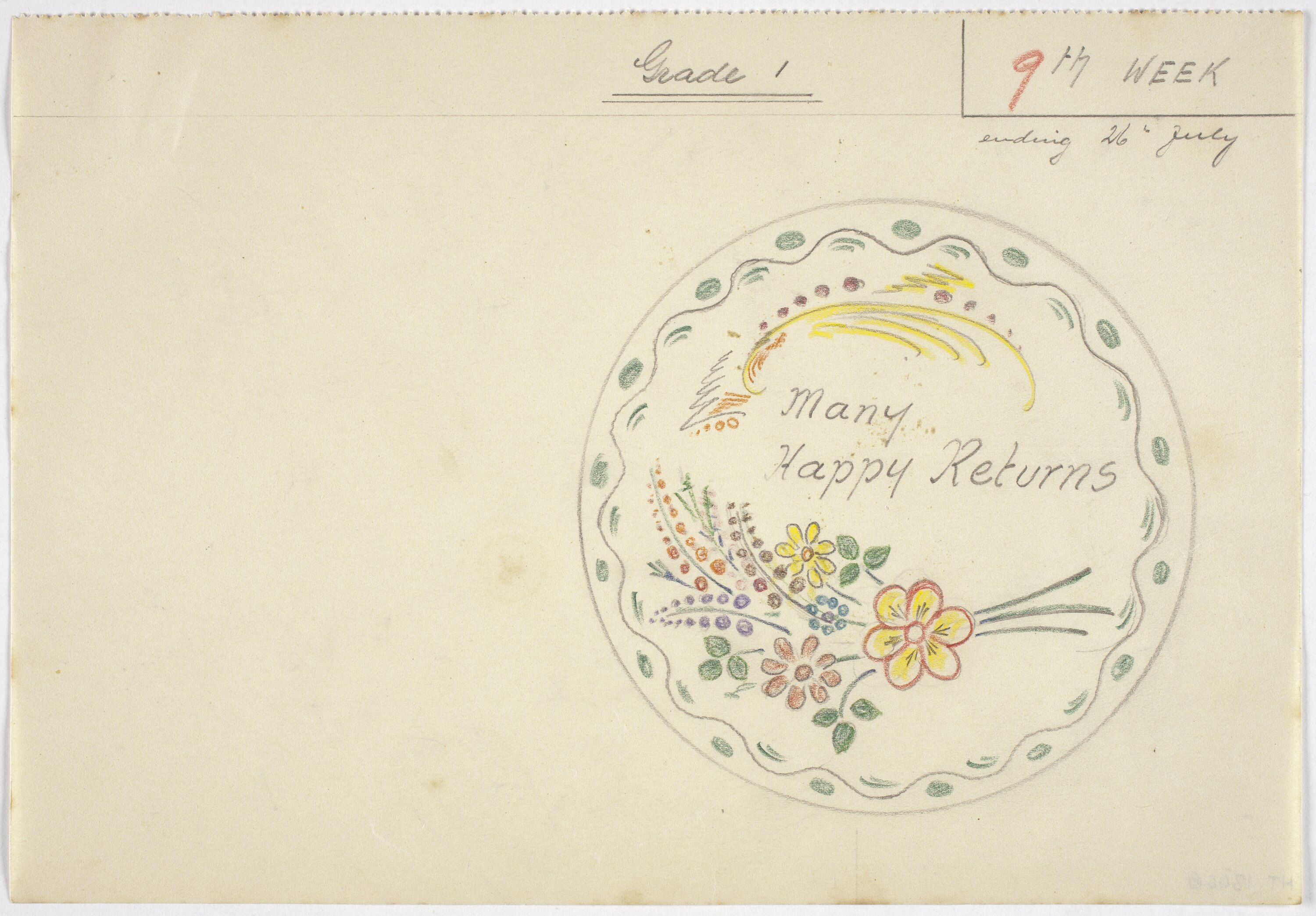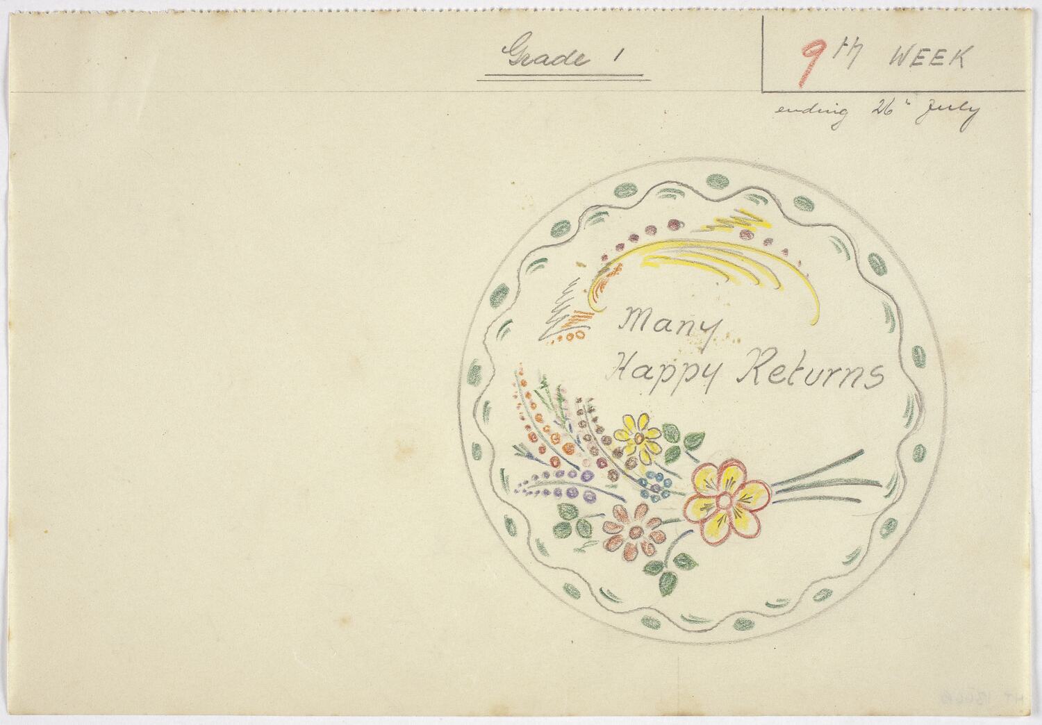 Lesson plan for Grade 1, 9th week. Hand drawn cake decoration design for birthday cake with floral bouquet motif in grey and coloured pencil on paper with red pencil numbering. Top edge of page is perforated, some foxing.