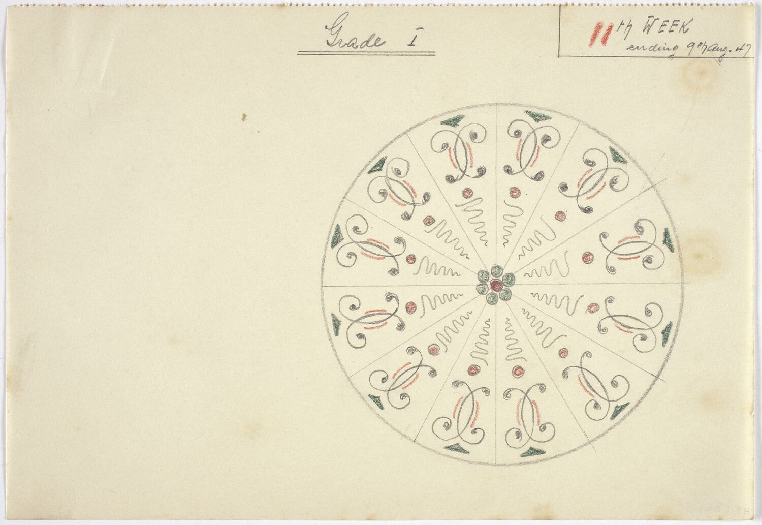 Lesson plan for Grade 1, 11th week. Hand drawn cake decoration design in grey and coloured pencil on paper with red pencil numbering. Top edge of page is perforated. Brown circular stains on left hand side of page.