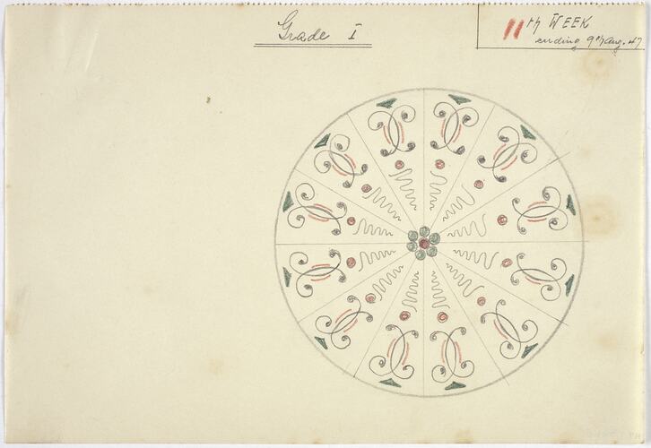 This is a lesson plan for cake decorating Grade 1, August, Week 11. It features a hand-drawn cake decoration design. Karl Muffler taught a cake decorating class to 60 returned ex-servicemen at William Angliss Food Trades School in Melbourne from May to August, 1947, under the Commonwealth Reconstruction Scheme. Karl took groups of 15 students at a time, receiving 20 shillings per two-hour session.