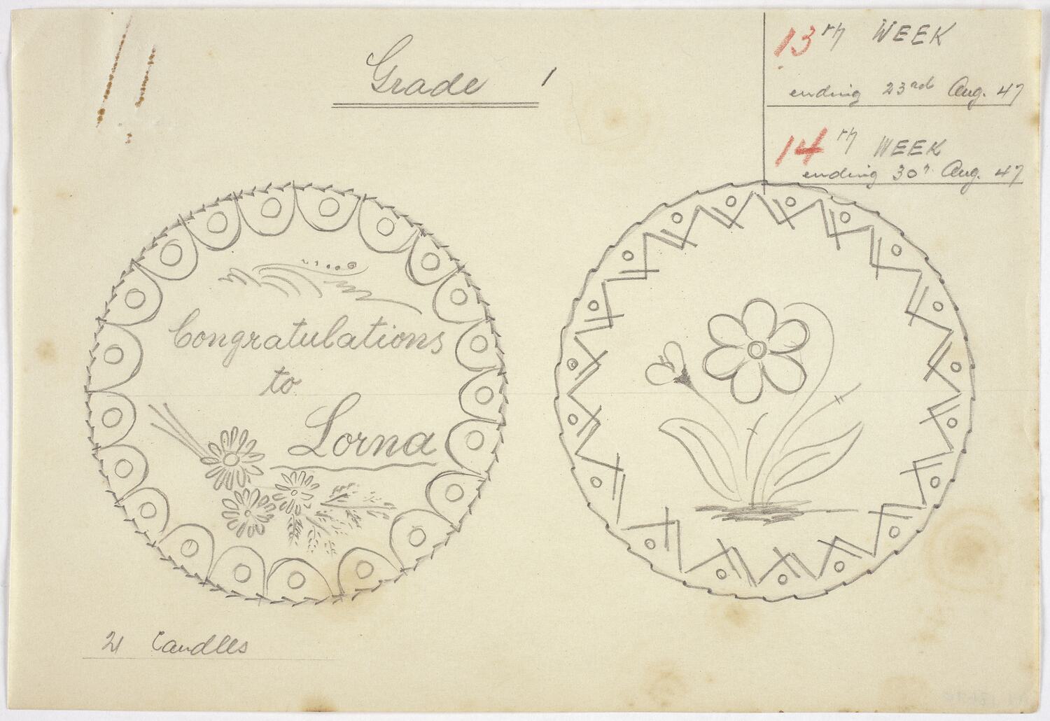 This is a lesson plan for cake decorating Grade 1, August, Weeks 13 and 14. It features hand-drawn cake decorations designs featuring flowers for two cakes. Karl Muffler taught a cake decorating class to 60 returned ex-servicemen at William Angliss Food Trades School in Melbourne from May to August, 1947, under the Commonwealth Reconstruction Scheme. Karl took groups of 15 students at a time, receiving 20 shillings per two-hour session.