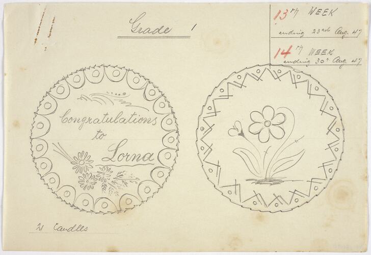 Handwritten across top: 'Grade 1 / 13th WEEK ending 23rd Aug. 47 / 14th WEEK ending 30th Aug. 47.' Handwritten on cake design: 'Congratulations / to / Lorna'. Handwritten on bottom: '21 Candles'.