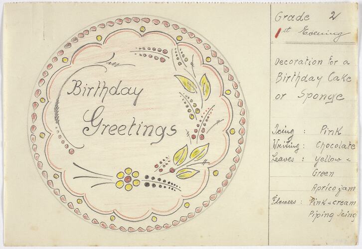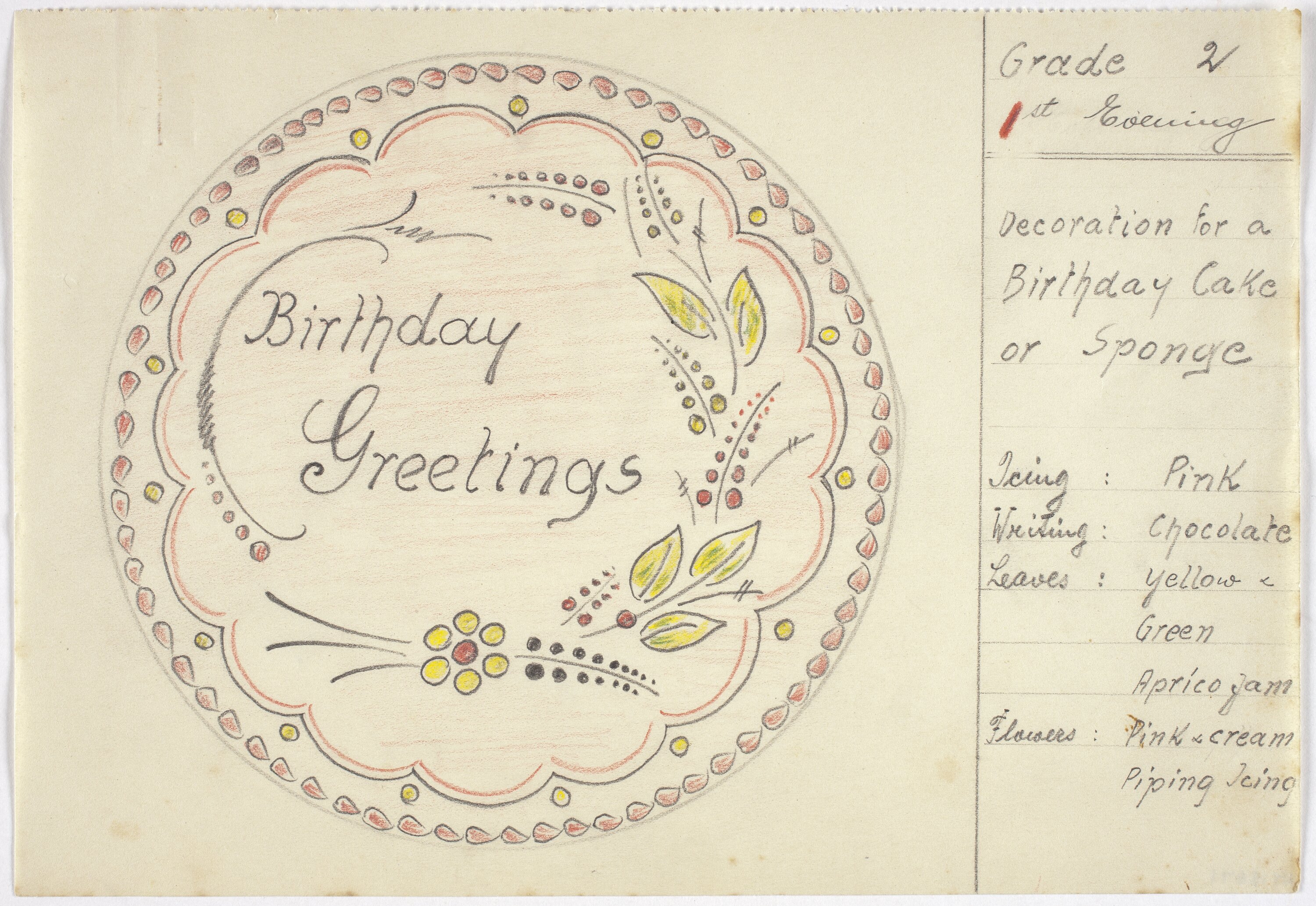 Handwritten on front on cake design: 'Birthday Greetings'. Handwritten on front on left hand side: Grade 2 / 1st Evening / Decoration for a / Birthday Cake / or Sponge / Icing: Pink / Writing: Chocolate / Leaves: / Yellow & Green / Apricot jam /Flowers: Pink & Cream / Piping Icing.'