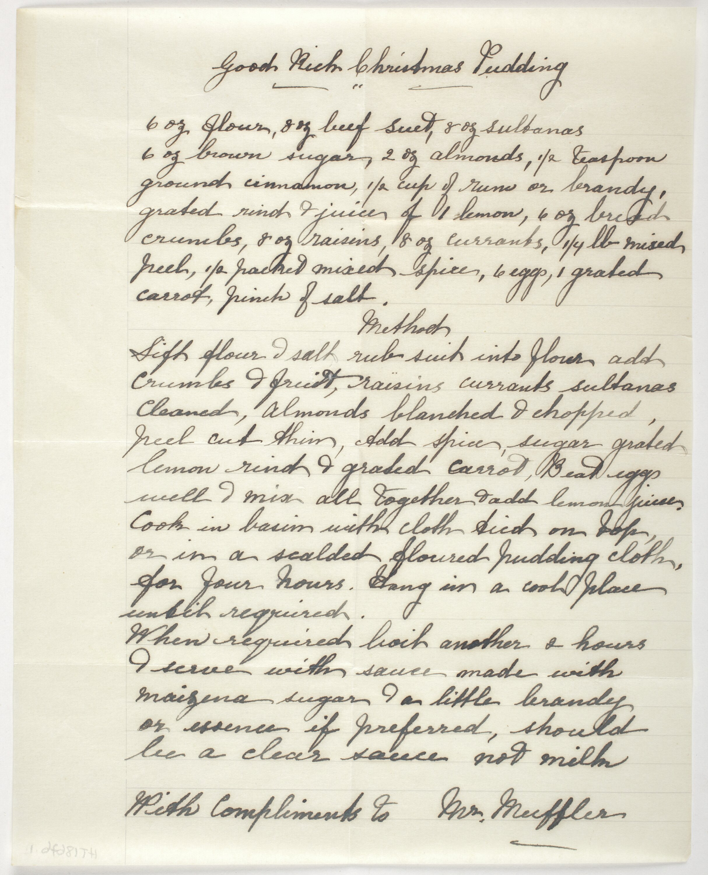 Hand written single page recipe for 'Good Rich Christmas Pudding' in an envelope; signed 'With Compliments to Mr Muffler. No indication who it is from.