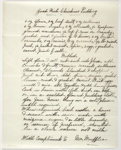 Recipe belonging to Karl Muffler, possibly given to him by a friend or customer for his own recipe collection. Hand written single page recipe for 'Good Rich Christmas Pudding' in an envelope; signed 'With Compliments to Mr Muffler. No indication who it is from.