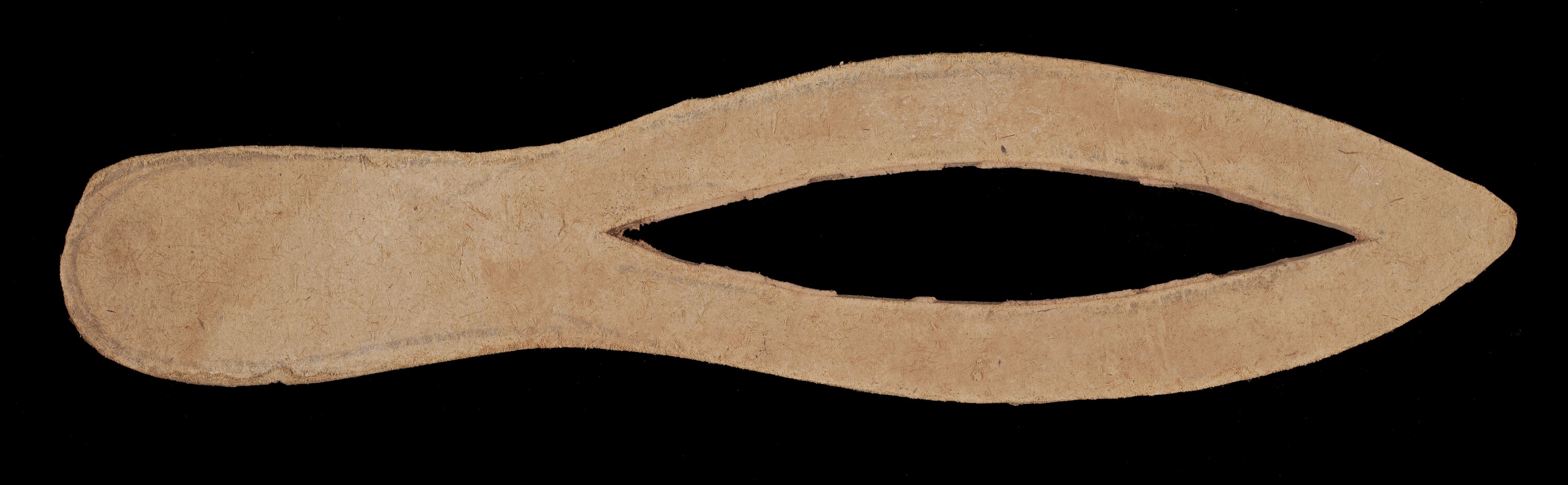 Elongated leaf shaped stencil from a group of 12 cardboard stencil cutouts, originally tied together with brown string. Stencils are of different sizes and shapes for creating decorations on cakes, used when modelling marzipan or icing. Stencil placed on surface and then knife used to cut around the shape which was then placed on cake for decoration. Wheel shapes placed on top of cake of similar diameter, dusted with icing sugar or cocoa to make a contrasting border when wheel removed.