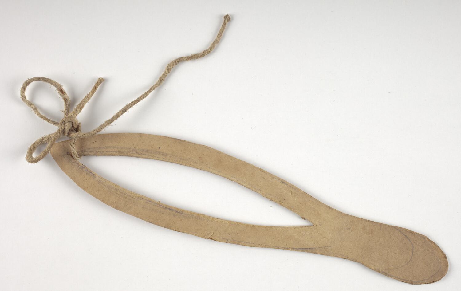 Large leaf shaped stencil from a group of 9 cardboard stencil cutouts, originally tied together with brown string. Stencils are of different sizes and shapes for creating decorations on cakes, used when modelling marzipan or icing. Stencil placed on surface and then knife used to cut around the shape which was then placed on cake for decoration. Wheel shapes placed on top of cake of similar diameter, dusted with icing sugar or cocoa to make a contrasting border when wheel removed.