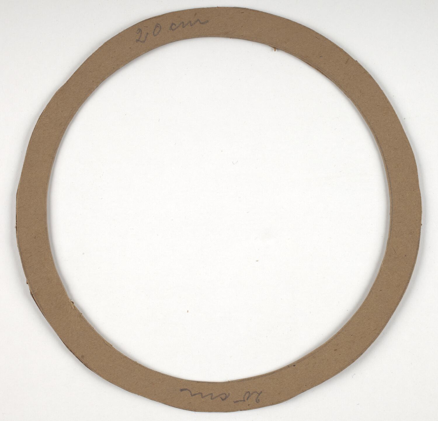 Ring shaped stencil from a group of 12 cardboard stencil cutouts, originally tied together with brown string. Stencils are of different sizes and shapes for creating decorations on cakes. Used when modelling marzipan or icing. Stencil placed on surface and then knife used to cut around the shape which was then placed on cake for decoration. Wheel shapes placed on top of cake of similar diameter, dusted with icing sugar or cocoa to make a contrasting border when wheel removed.