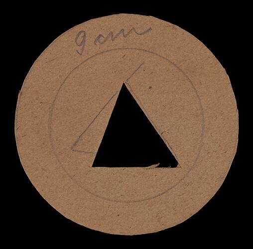 This is one of a collection of twenty six cardboard stencil cutouts of different sizes and shapes for creating decorations on cakes. They are used when modelling marzipan or icing. The stencil is placed on the cake surface, and a knife is then used to cut around the shape which is then placed on the cake for decoration. Circular shapes can be placed on top of a cake of similar diameter, and then dusted with icing sugar or cocoa to make a contrasting border when the stencil is removed. The stencil was made by German pastry chef Karl Muffler and was used by him during his career as a pastry chef and confectioner in Melbourne from the 1930s and during teaching cake decorating at William Angliss Food Trades School during the 1940s.