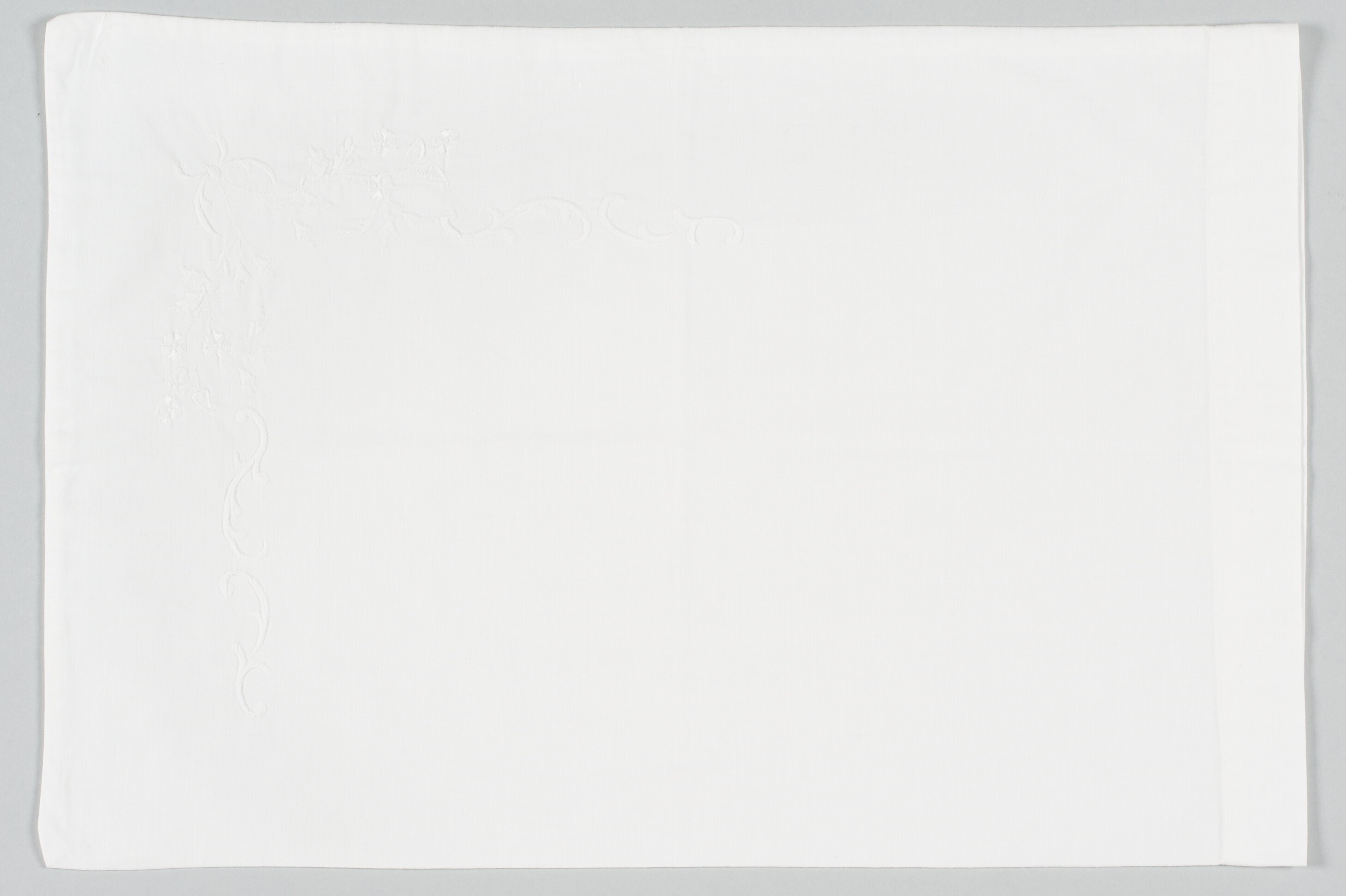 White cotton pillowcases, hand embroidered in white cotton thread with a pattern of flowers and vines.