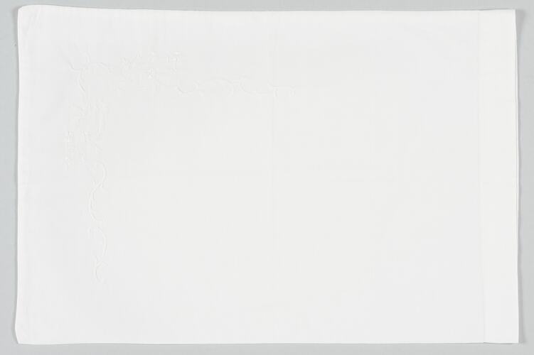Pair of pillow cases purchased in Italy for Edda Azzola's glory box by her mother. They were hand embroidered by Edda. Edda Azzola, nee Pugnetti, was born in 1927 in Moggio Udinese in the Friuli region, northern Italy and the family moved to nearby Pontebba four years later. After their early schooling, Edda and her two sisters worked as knitting machinists from the family home. The income they made was saved by their mother who used the money to purchase items for their dowries. Edda's dowry included 6 pairs of double linen sheets which she embroidered, 12 towels and other items.