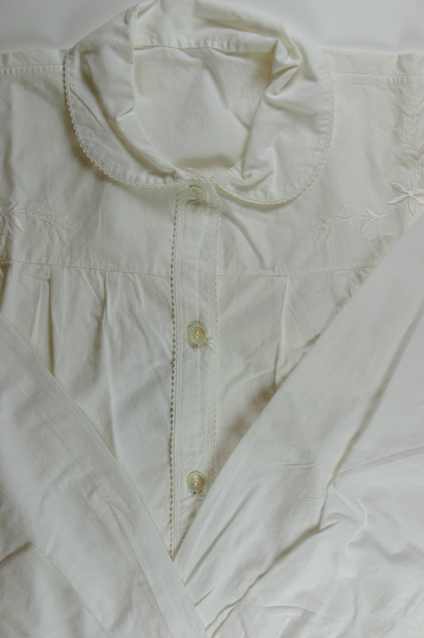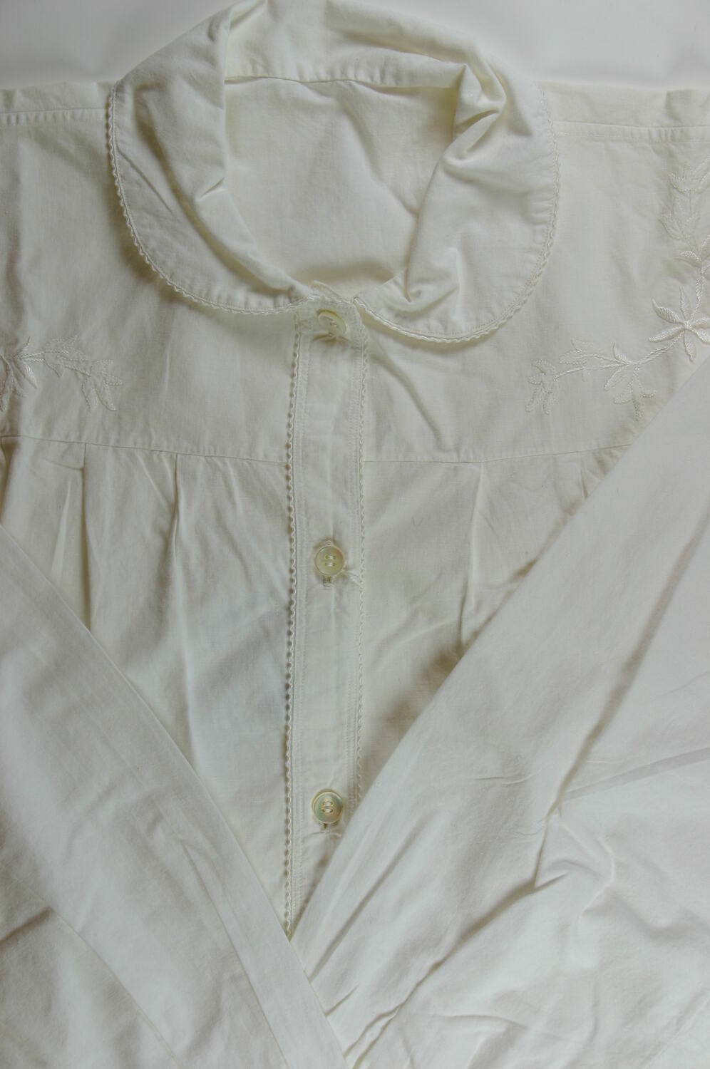 Long white cotton nightdress with long sleeves and buttoned cuffs, and a Peter Pan collar. The front of the nightdress has been hand embroidered in white cotton thread with a pattern of flowers and vines.