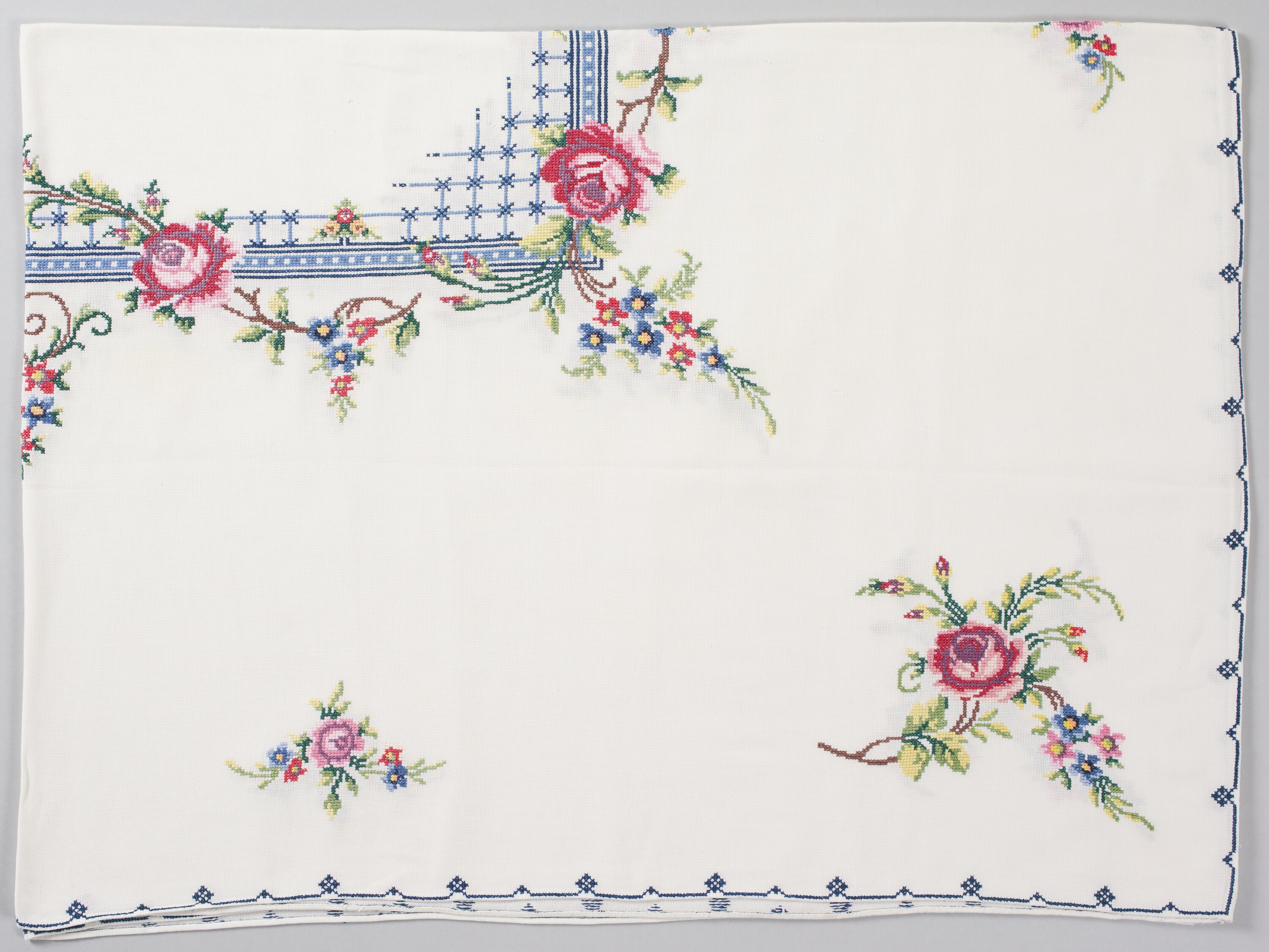 White cotton table cloth, that has been hand embroidered with a boarder of roses winding around a navy and light blue framework with a geometric design. The embroidery has been done in red, pink, light blue, navy, brown, green, white and yellow.
