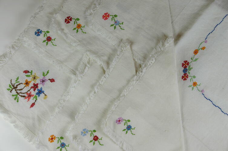 Supper cloth and serviettes purchased in Italy for Edda Azzola's glory box by her mother. They were hand embroidered by Edda. Edda Azzola, nee Pugnetti, was born in 1927 in Moggio Udinese in the Friuli region, northern Italy and the family moved to nearby Pontebba four years later. After their early schooling, Edda and her two sisters worked as knitting machinists from the family home. The income they made was saved by their mother who used the money to purchase items for their dowries. Edda's dowry included 6 pairs of double linen sheets which she embroidered, 12 towels and other items.