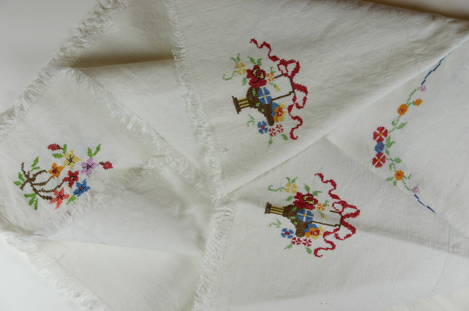 White cotton Supper Cloth, with fringing around the edges. It has has been hand embroidered with a floral pattern done in cross stitch in pink, red, yellow, purple, blue, red, green and brown.
