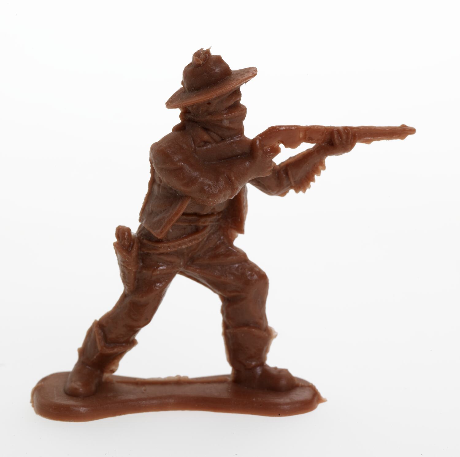 Brown plastic cowboy with legs apart holding rifle. Figure wears chaps, shirt, kercheif over his lower face, hat, belt and gun in holster.