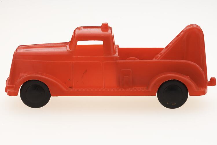 Red plastic tow truck toy used and owned by Bill Boyd in the 1950s.