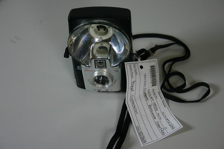 This popular snapshot camera was first made by Eastman Kodak in the USA in 1957 and manufacture continued until 1965. It is part of the Kodak Star range of cheap, easy to use cameras. It has a plastic body, fixed focus Dakon lens and used 127 roll film. It has a built-in flash with a parabolic reflector and used a single, small flash bulb.
