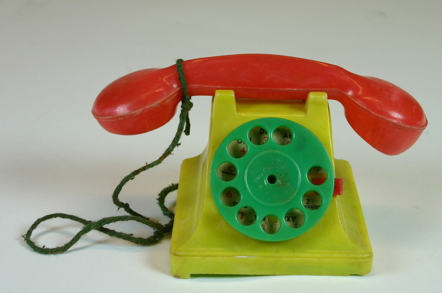 Small yellow toy telephone with green dial and red handset.