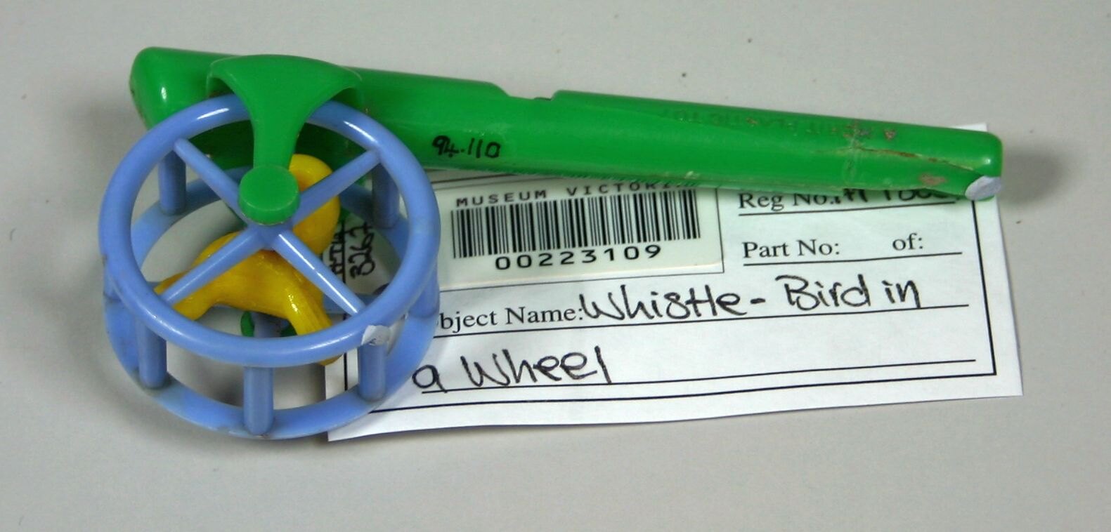 Small green plastic whistle with blue wheel containing yellow bird which rotates on blowing.